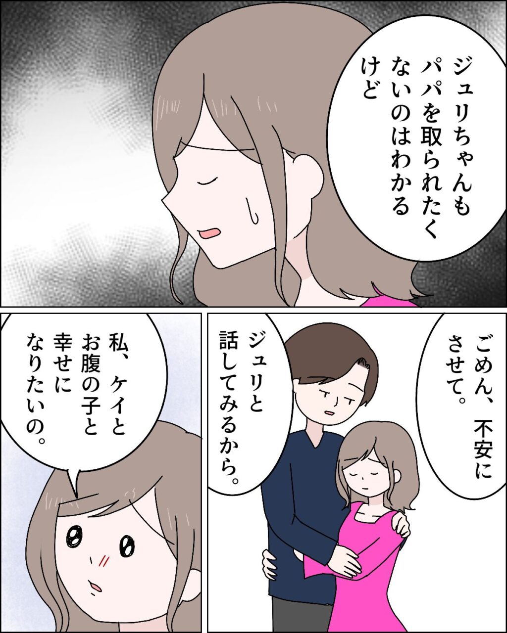 「ジュリちゃんもパパを取られたくないのはわかるけど」エリカさんは、深くため息をつきながらつぶやきます。「ごめん、不安にさせて・・・ジュリと話してみるから」ケイさんはそう言ってエリカさんを優しく抱き寄せました。