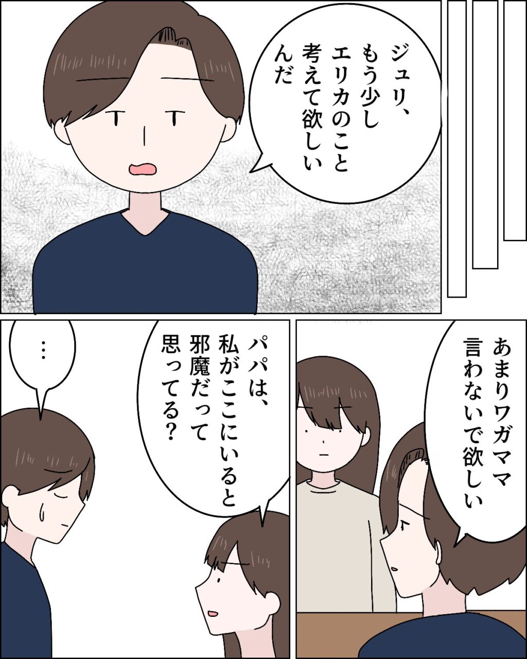 勝手に自分の部屋を作らせたり、お弁当や塾の送り迎えを頼んだり、さらには自分の母親と比べてきたり・・・ジュリちゃんに振り回され続ける毎日に、エリカさんは次第に限界を感じ始めました。ですが、家庭を壊した立場という負い目から、嫌だと言い出すこともできず、不満ばかりが積もっていきます。