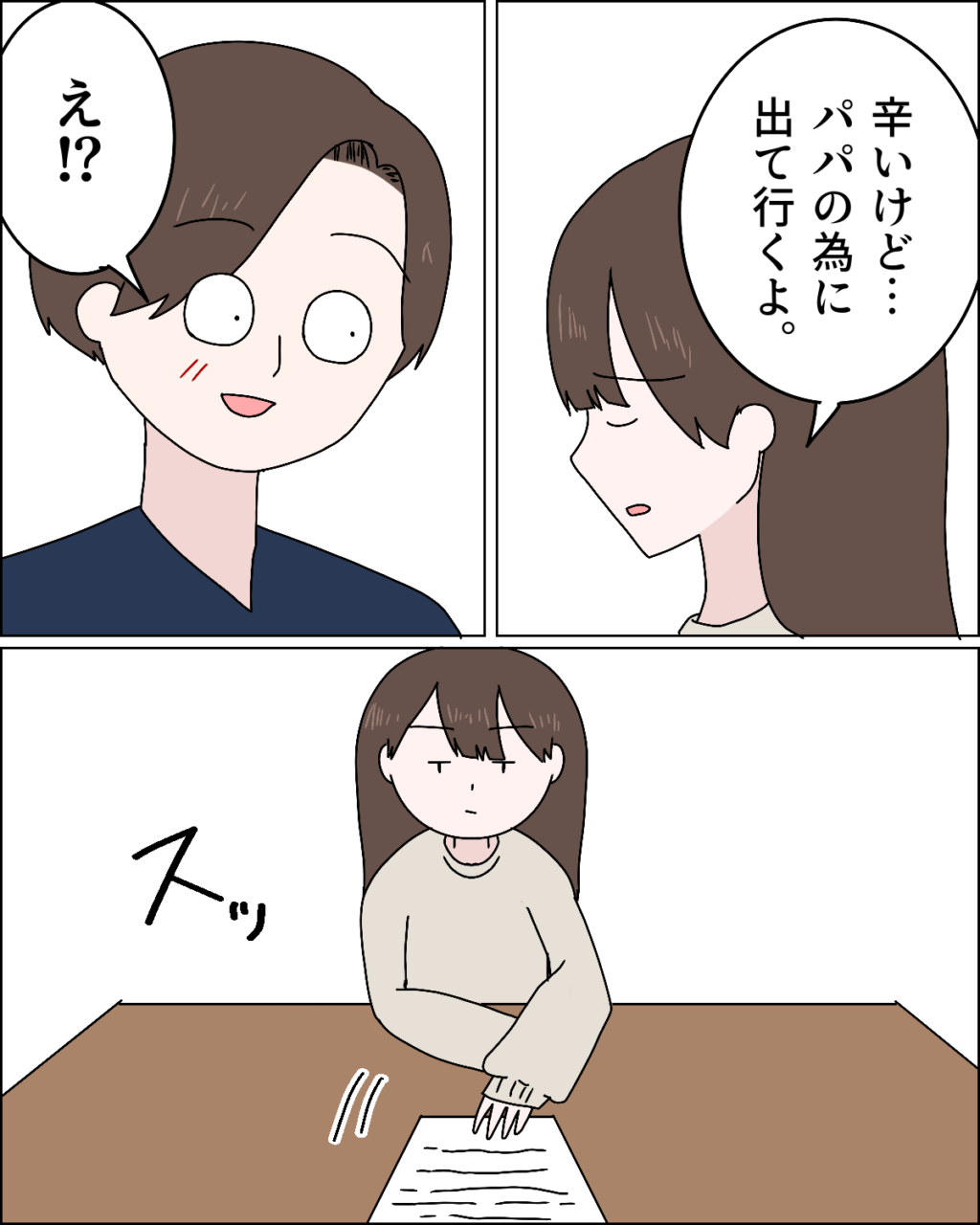 「辛いけど・・・パパのために出て行くよ」ジュリちゃんはうつむいたまま、小さくつぶやきました。その言葉を聞いたケイさんは、「え!?」と思わず嬉しそうな表情を浮かべます。すると次の瞬間、ジュリちゃんは急に表情を変え、机の上に1枚の書類を出しました。