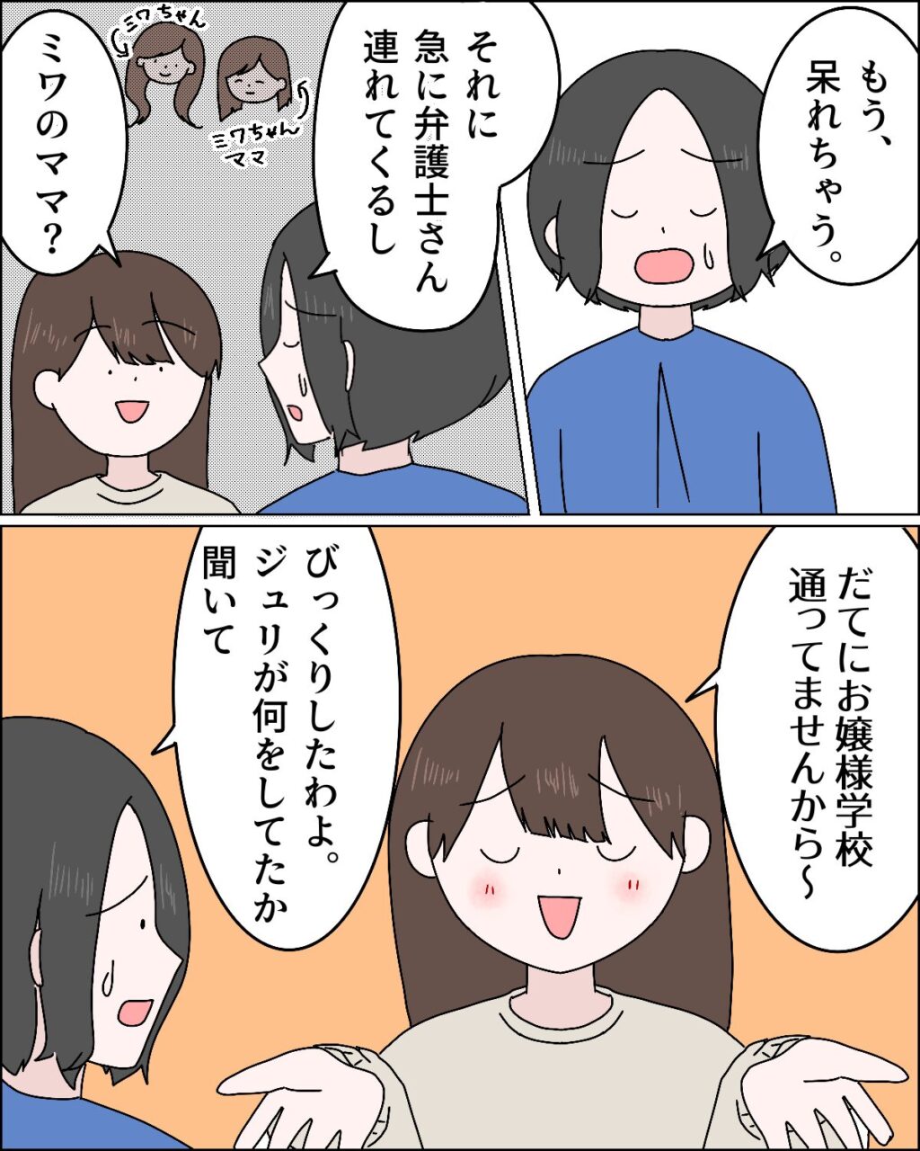 「もう呆れちゃう、それに急に弁護士さん連れてくるし」リナさんはため息まじりに言いました。実はジュリちゃん、今回の離婚の件を弁護士のお母さんをもつ友達にこっそり相談していました。「だてにお嬢様学校通ってませんから~」とおどけて言うジュリちゃん。リナさんは呆れ顔のまま、「びっくりしたわよ、ジュリが何をしてたか聞いて」と言いました。