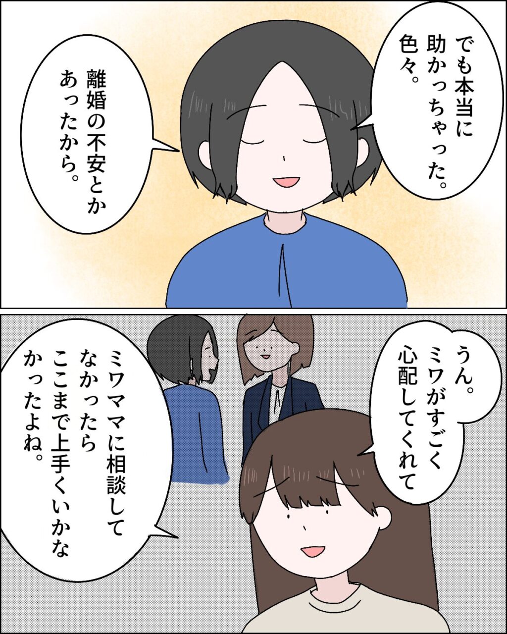 リナさんはふっと優しく笑い、「でも本当に助かっちゃった色々、離婚の不安とかあったから」と感謝の気持ちを伝えます。ジュリちゃんはママが自分たちのために離婚はしないと決めていたことも知っていました。でもママには幸せになってほしいと思っていたジュリちゃんはママが離婚したほうが幸せだと感じていたのです。「ミワがすごく心配してくれて、ミワママに相談してなかったらここまで上手くいかなかったよね」と言いました。