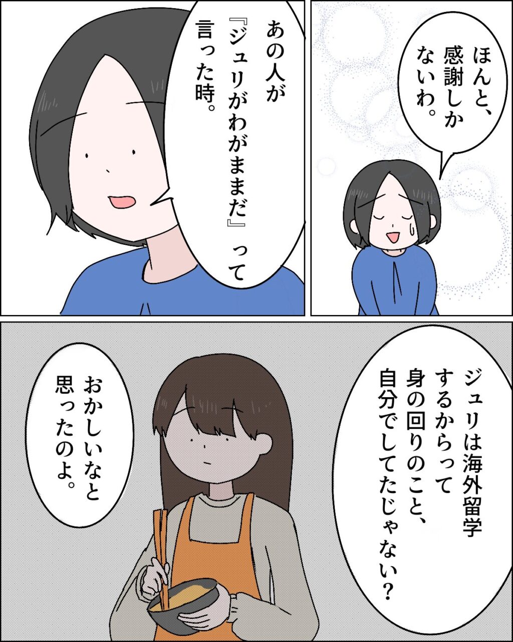 「ほんと感謝しかないわ」リナさんは、心の底からそう言いました。そして、ジュリちゃんの復讐計画に気づいた経緯を語り始めます。「あの人が『ジュリがわがままだ』って言った時、ジュリは海外留学するからって身の回りのこと自分でしてたじゃない?だからおかしいと思ったのよ」