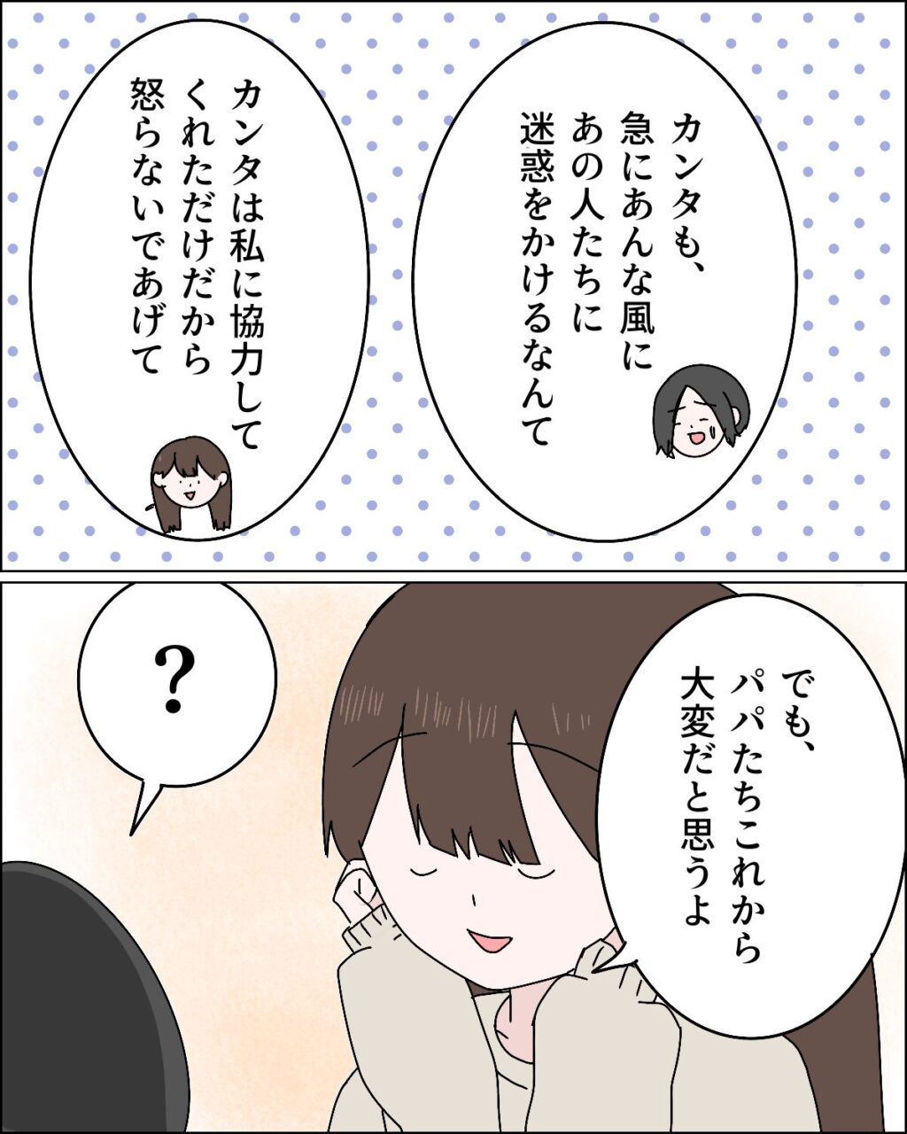 「カンタも、急にあんな風にあの人たちに迷惑をかけるなんて」普段の姿からは想像できない行動に驚いたと話すリナさんに、ジュリちゃんは「カンタは私に協力してくれただけだから怒らないであげて」と言いました。そして少し考えるように視線を落とすと、「でも、パパたちこれから大変だと思うよ」とつぶやきました。