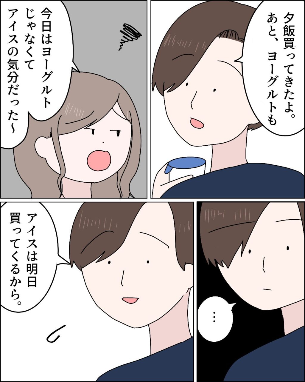 「夕飯買ってきたよ。あと、ヨーグルトも」ケイさんがそう言うと、「今日はヨーグルトじゃなくてアイスの気分だった~」と不満そうに言うエリカさん。そう言われて「・・」少し考えた後、「アイスは明日買ってくるから」とケイさんが言うと、