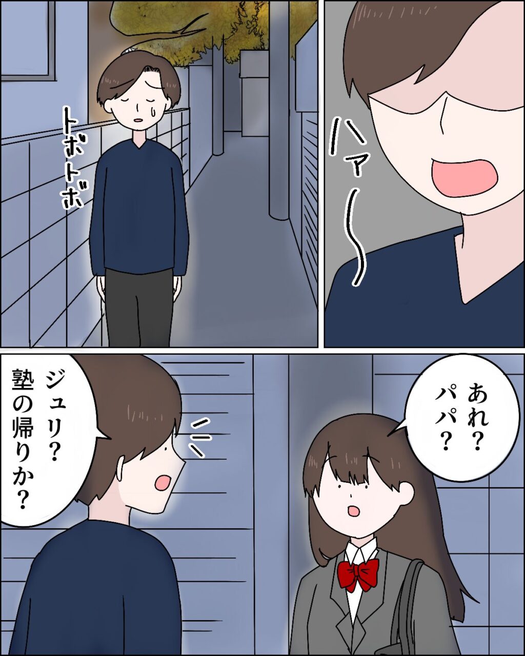 外に出たケイさんが「ハァ~」と大きなため息をつくと、「あれ?パパ?」とジュリちゃんが登場。「ジュリ?塾の帰りか?」とケイさんがたずねると、