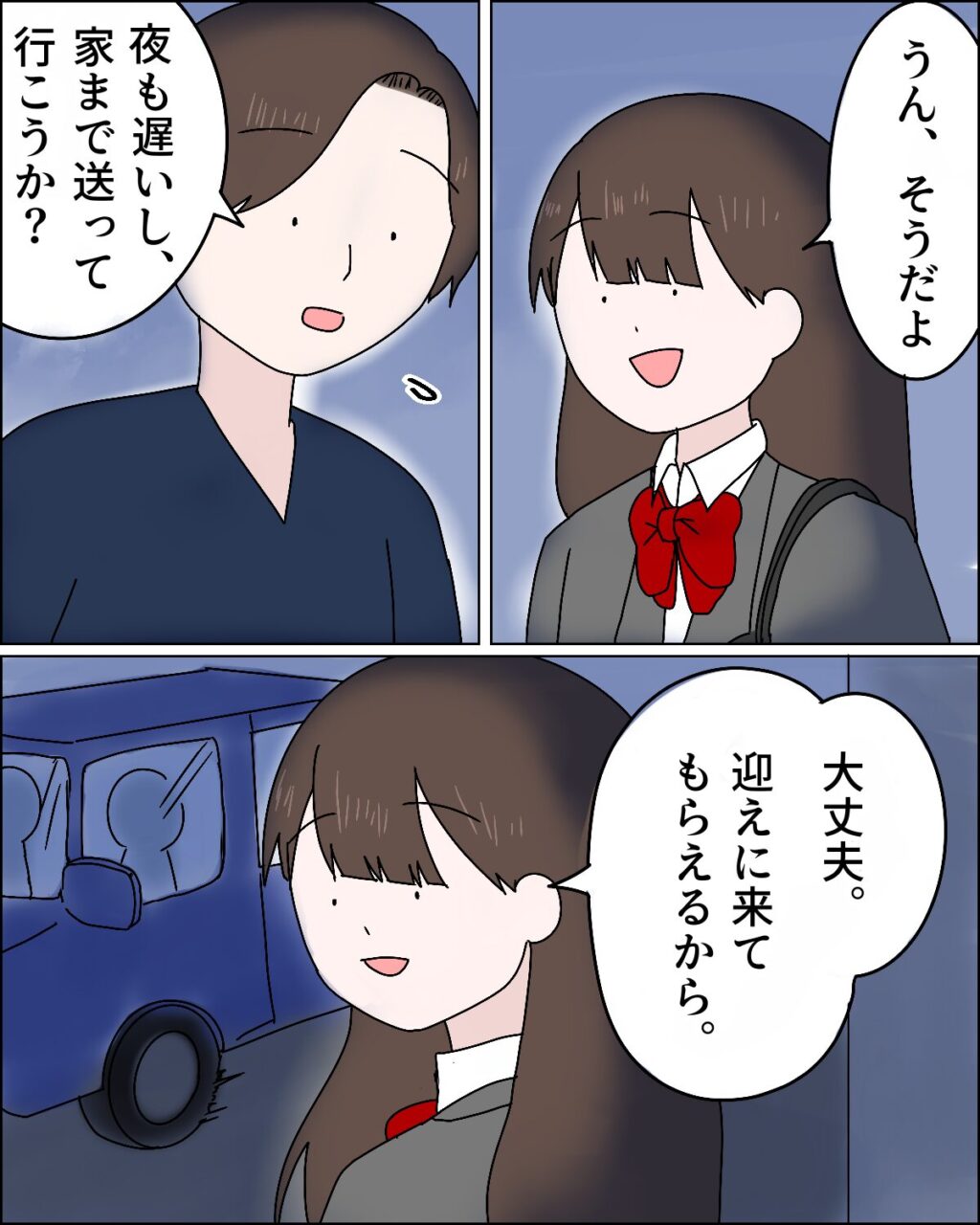 「大丈夫。迎えに来てもらえるから」家まで送ると娘に言うも優しく拒否