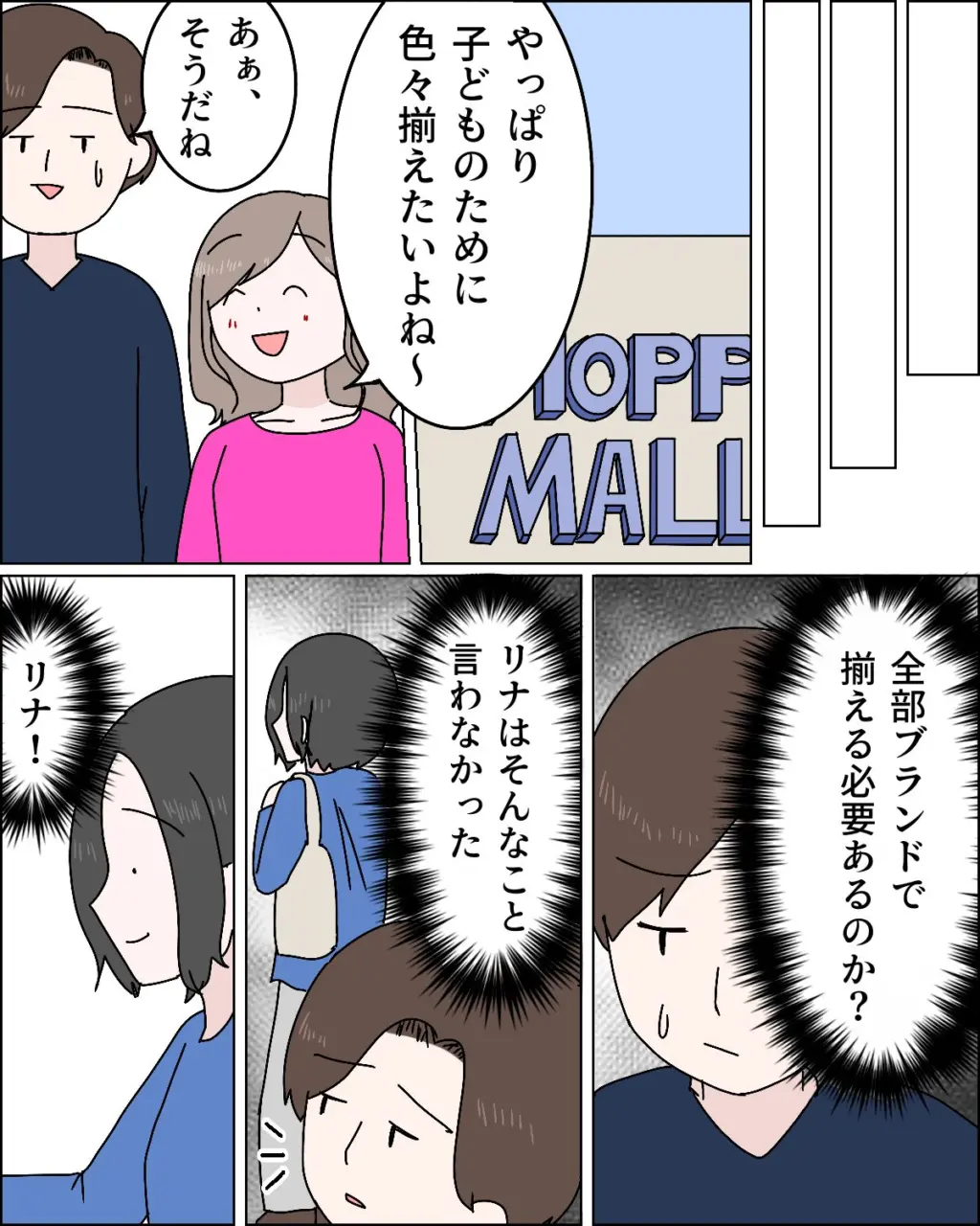 後日、ケイさんとエリカさんはショッピングモールにベビー用品を買いに行きました。「やっぱり子どものために色々揃えたいよね~」とウキウキのエリカさんに対し、「あぁ、そうだね」と言いながらもあまり乗り気ではないケイさん。ブランドにこだわってベビー用品を選ぶエリカさんを見て「全部ブランドで揃える必要あるのか?リナはそんなこと言わなかった」とまたリナさんとエリカさんを比べてモヤモヤしていると、偶然リナさんの姿を見つけました。