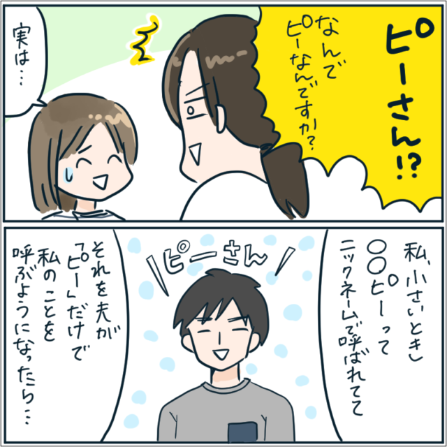 「ピーさん!?なんでピーなんですか?」予想通りの反応をする先生に、私はそうなった経緯を話しました。「実は・・・私、小さいとき〇〇ピーってニックネームで呼ばれてて、それを夫が『ピー』だけで私のことを呼ぶようになったら・・・」