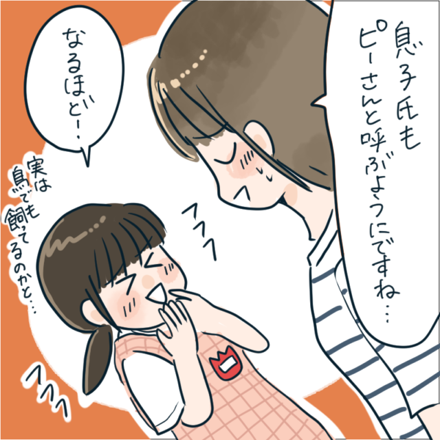 「息子氏もピーさんと呼ぶようにですね・・・」息子が私のことをママでもなくマミーでもなくピーさんと呼ぶようになった理由を聞いた先生は、「なるほど!実は鳥でも飼ってるのかと・・・」と言ってフフフと笑っていました。