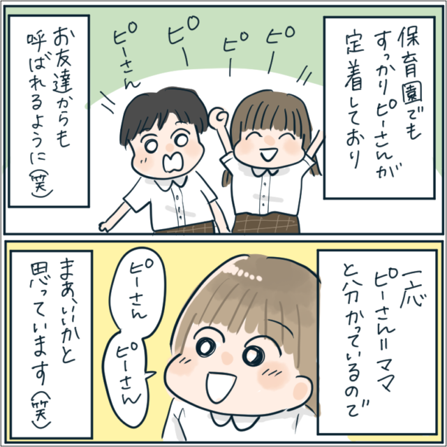 保育園でもすっかりピーさんが定着しており、息子のお友達からも呼ばれるようになりました(笑)一応、息子が「ピーさん=ママ」と分かっているので、まぁいいかと思っています(笑)