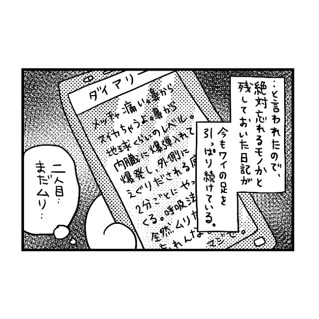 す、すごい!しっかり日記に綴られてるんですねー!忘れたくても忘れられない壮絶な戦い!・・自分のことを思い出して震えました(汗)思った以上に・・覚えているものですね。やっぱり日記に書いたからでしょうか(笑)