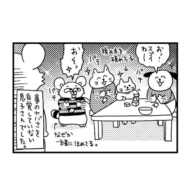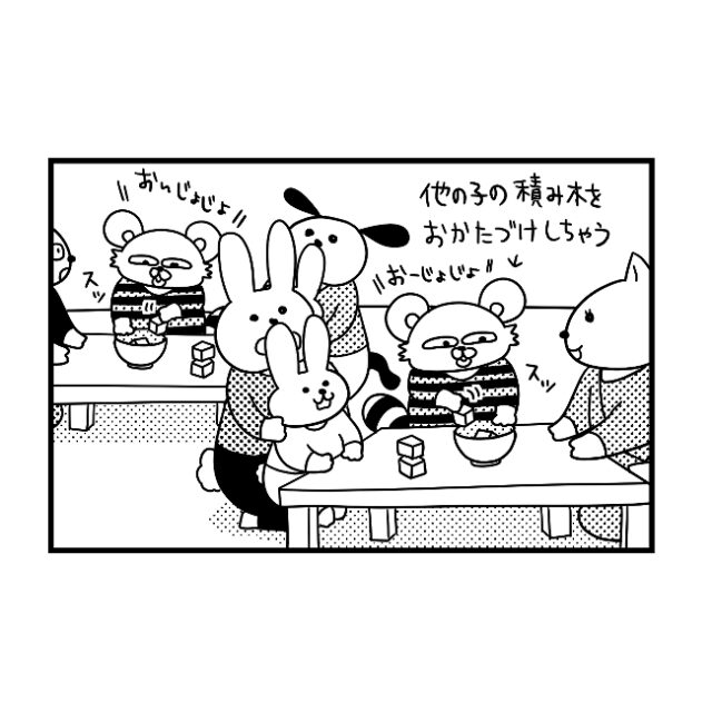 ふふふ・・・とっても楽しそな息子さんですね(笑)。他の子の積み木を褒めてあげたり、お片付けしてあげたり(しなくていいよー)、とっても忙しそうです(笑)。