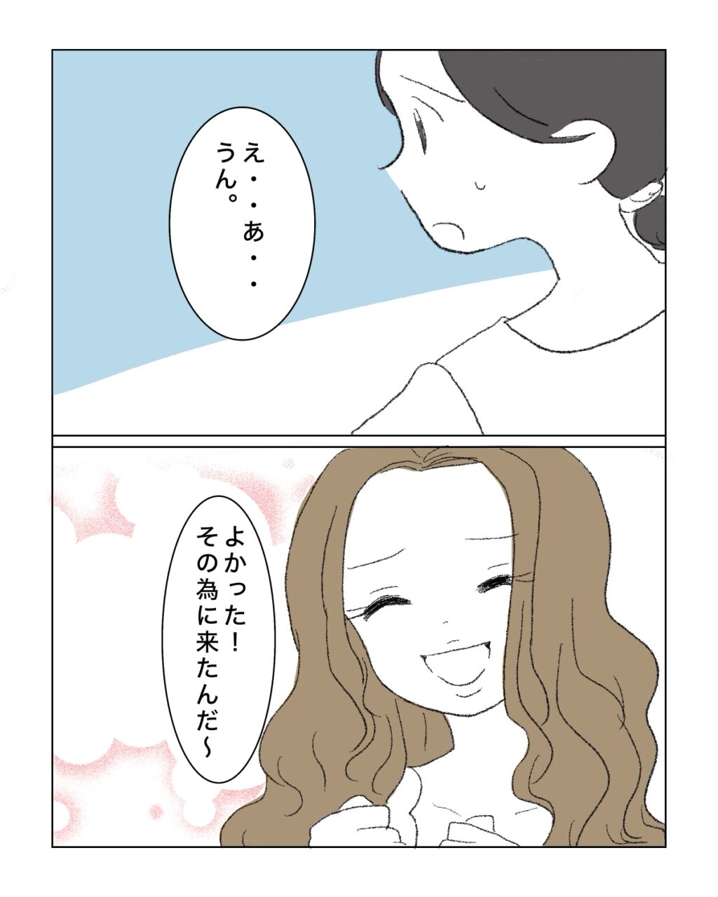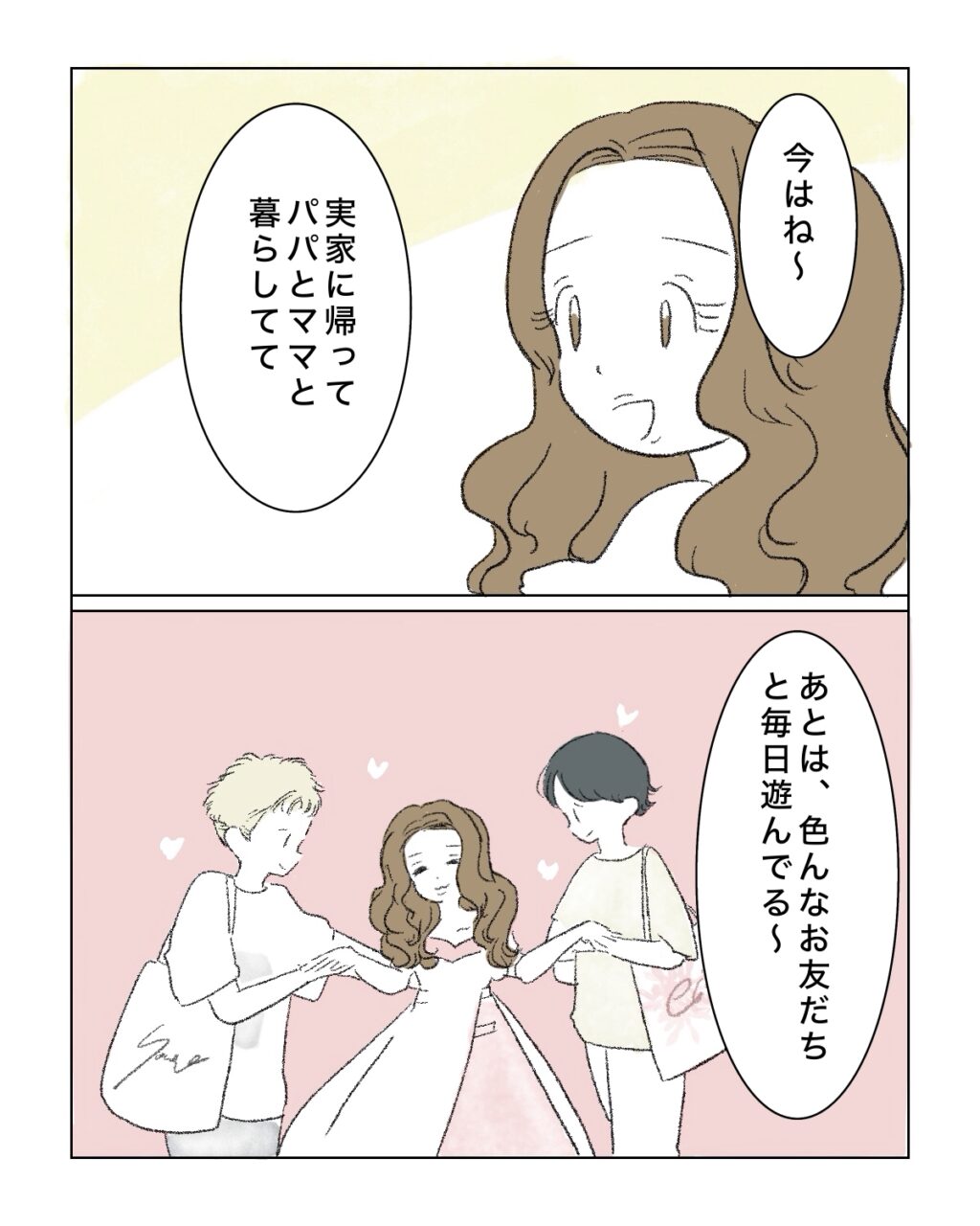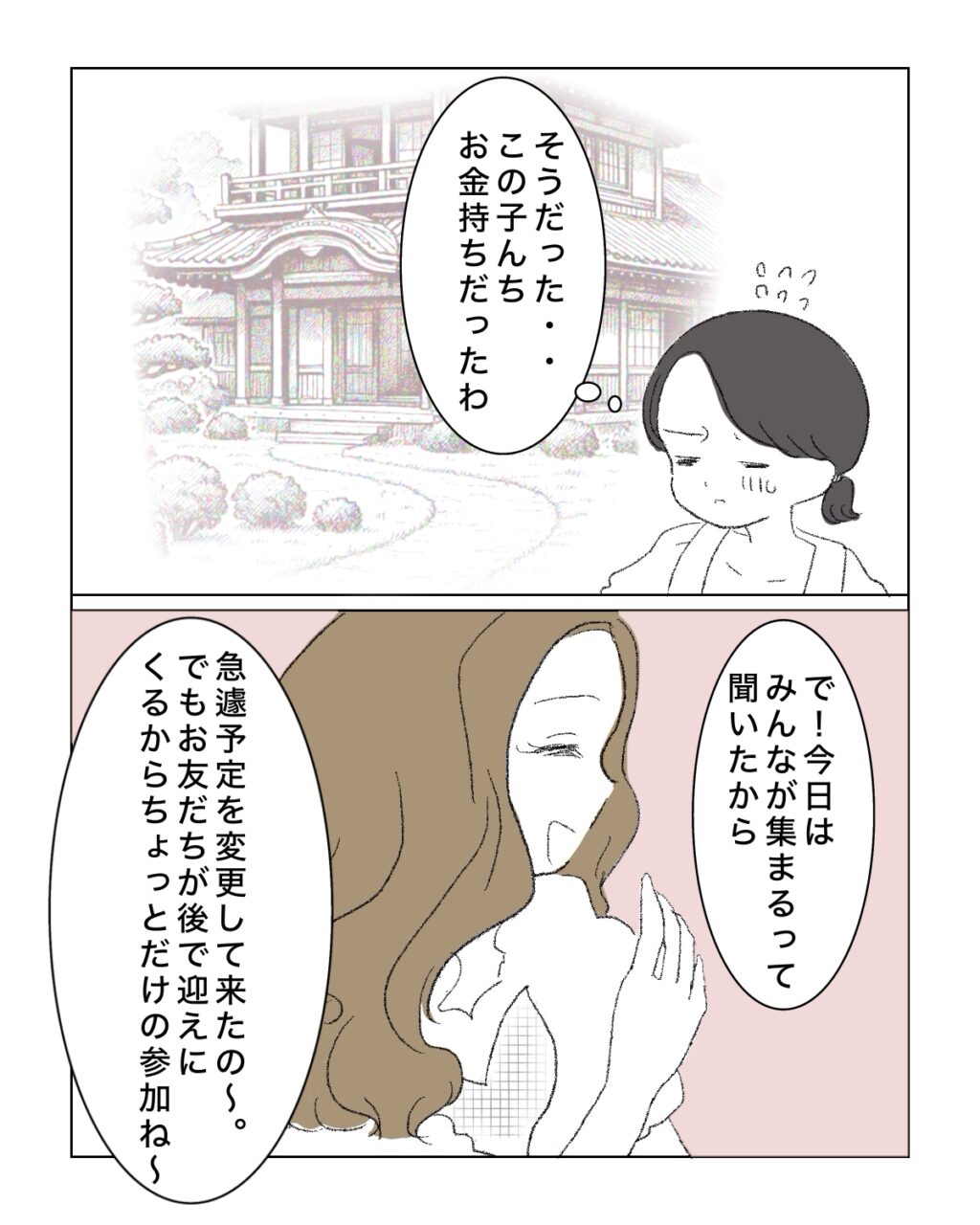 「そうだった・・この子んちお金持ちだったわ」と思い出していると、「で!今日はみんなが集まるって聞いたから、急遽予定を変更して来たの~。でもお友だちが後で迎えにくるから、ちょっとだけの参加ね~」誰も聞いていない予定を話し出すのでした。