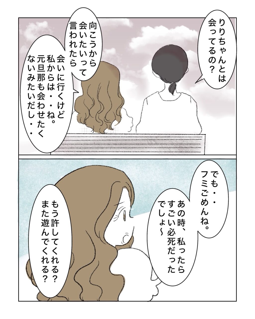離婚し、彼氏とも別れ、娘りりちゃんの親権は元ご主人にあるというアンナさんは、実家に帰って両親と暮らし、いろんな『お友だち』と毎日遊んでると話しました。そう、アンナさんの家はお金持ちだったのです。そして、フミさんと二人きりになると、「フミごめんね。あの時すごい必死だったでしょ。もう許してくれる?また遊んでくれる?」アンナさんにそう言われ、「え・・あ・・うん」としか答えられなかったフミさんに、「よかった!そのために来たんだ~」と満面の笑みを浮かべるアンナさん。すると、一台の車から降りて来た男性2人組に声を掛けられ、「みんなお疲れ~」そう言って颯爽と車に乗り込むアンナさん。これが、離婚して、りりちゃんの親権を渡してまでしたかったことなのでしょうか。