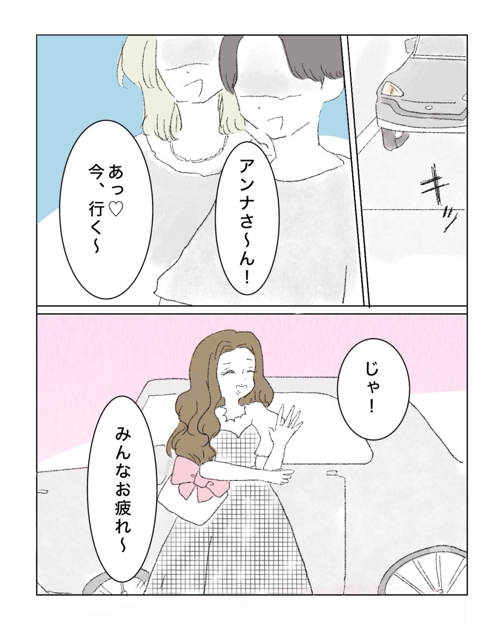 すると、一台の車が停まり、「アンナさ~ん!」と声をかける二人の男性。「あっ!今行く~」男性の姿に気づいたアンナはうれしそうな声を出し、「じゃ!みんなお疲れ~」そう言って、車に乗り込んだのでした。