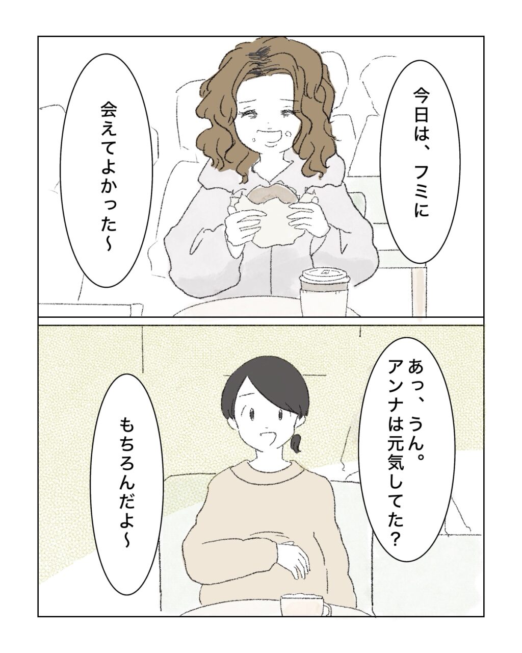 「今日は、フミに会えてよかった~」カフェでハンバーガーを食べながら笑顔で話すアンナさん。「今度みんなと集まる時教えて~!最近さ~」と自分のことばかり話した後、「私もう行かなきゃ!」と言って帰って行ったアンナさんを見て、「なんか・・アンナ雰囲気変わったな」と呟いた後、サツキに連絡すると、「え??大丈夫だった?」という返信に「え?何が??」とこちらがビックリ!サツキさんに詳しく話を聞くことにしたのでした。