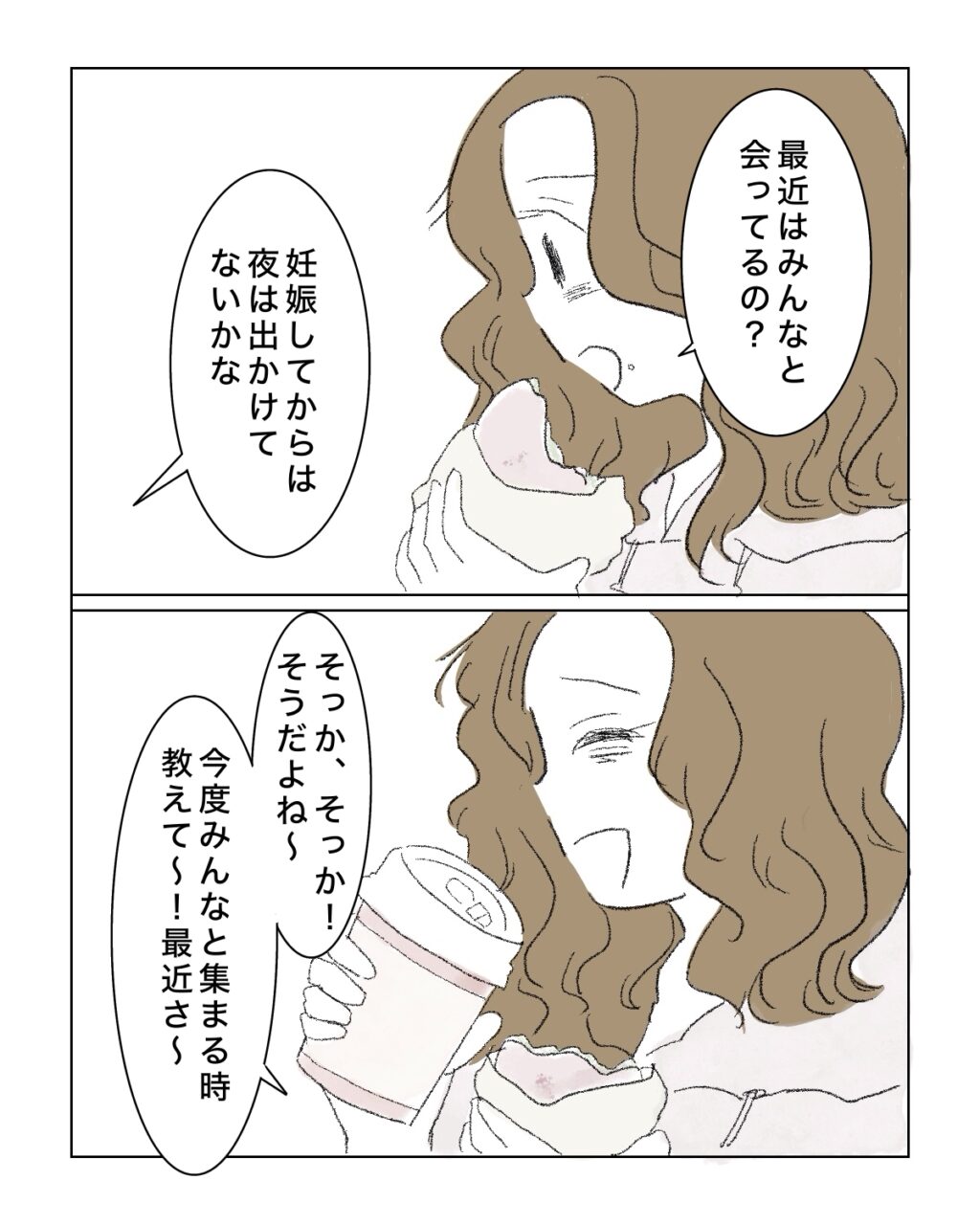 「最近はみんなと会ってるの?」とたずねられ、「妊娠してからは夜は出かけてないかな」と答えると、「そっか、そっか!そうだよね~。今度みんなと集まる時教えて~!最近さ~」と笑いながら言い、