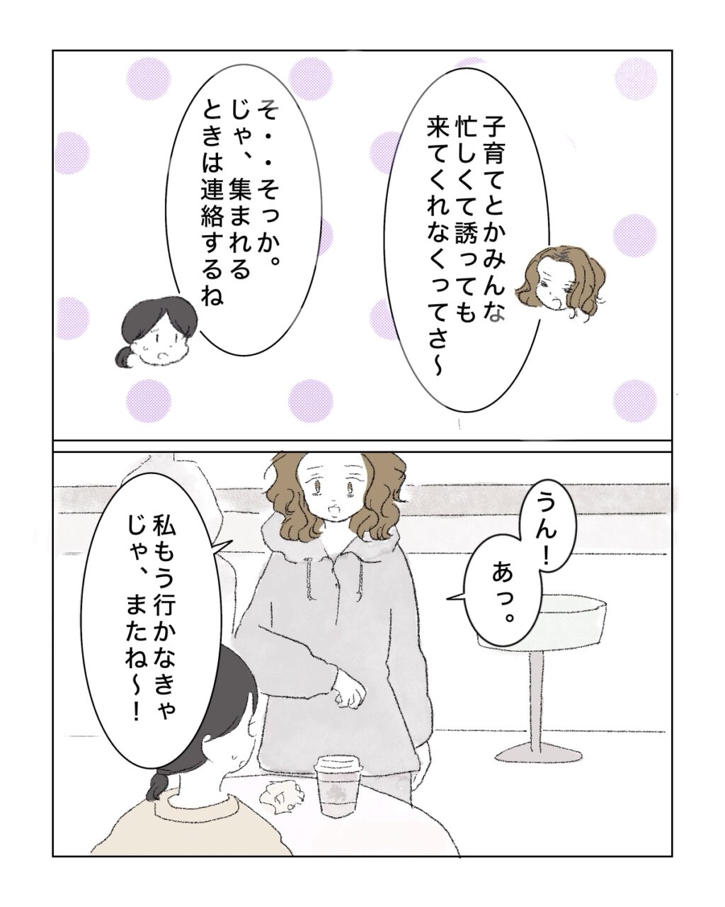 「子育てとか、みんな忙しくて、誘っても来てくれなくなってさ~」そう言われ、「そ・・そっか。じゃ、集まれるときは連絡するね」と答えると、「うん!あっ。私もう行かなきゃ!じゃ、またね~!」食べ終わったとたんにそう言って立ち上がるアンナ。