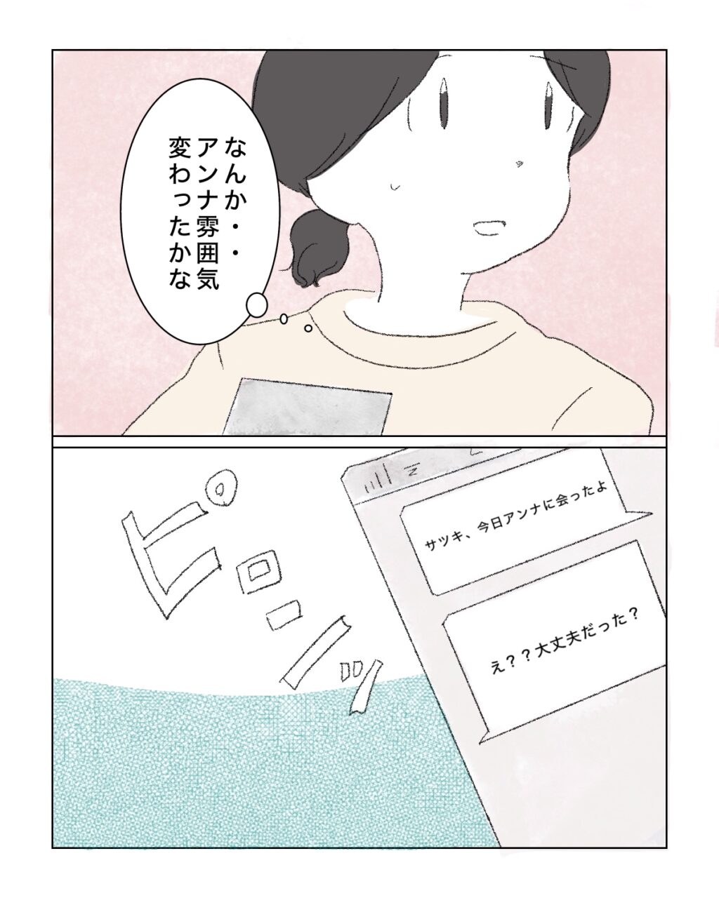 「なんか・・アンナ雰囲気変わったかな」そう呟いた後、サツキにメッセージを送る私。「私:サツキ、今日アンナに会ったよ」そう送ると、すぐ「サツキ:え??大丈夫だった?」と返信が!