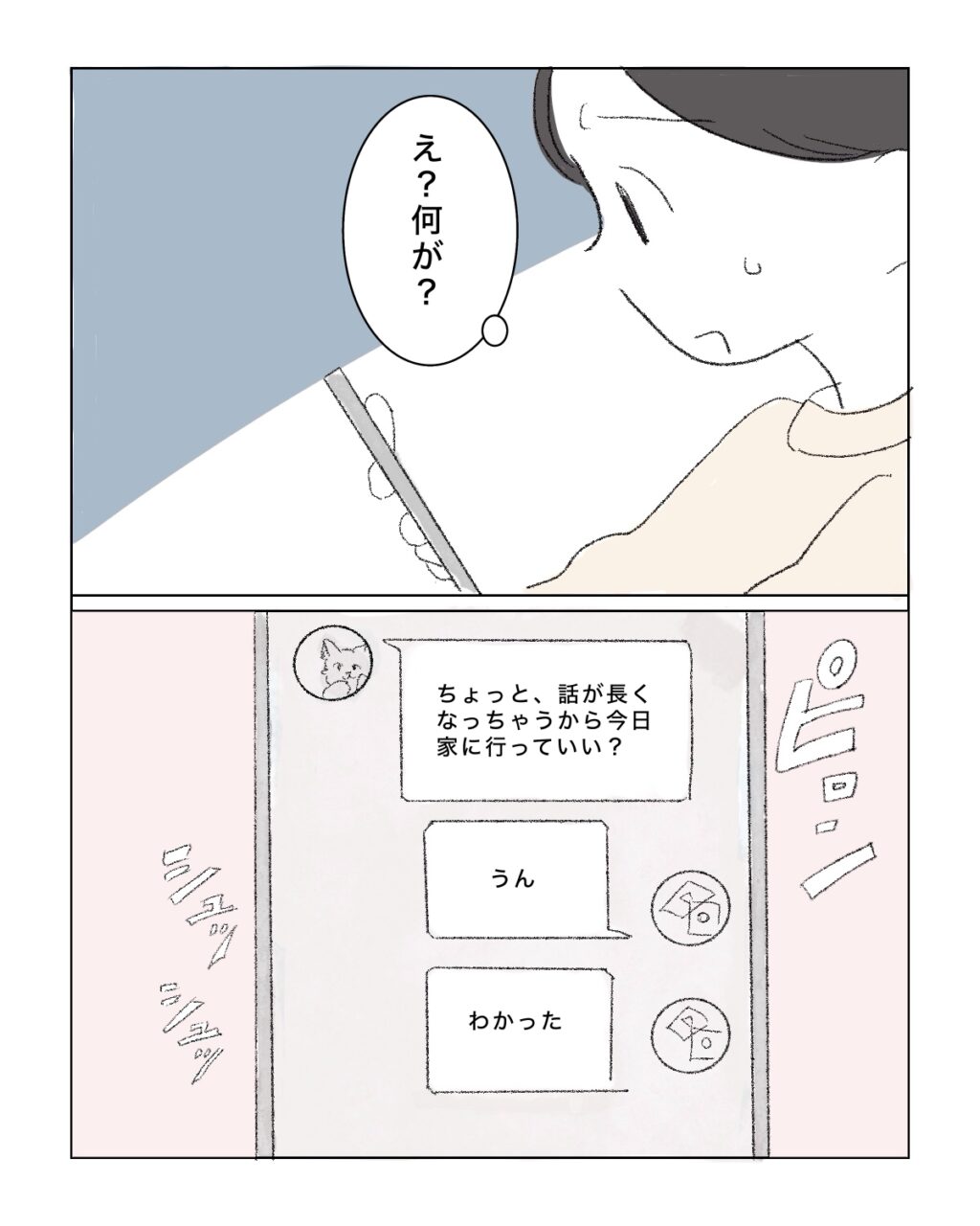 サツキの反応に、「え?何が?」と聞き返すと、「サツキ:ちょっと、話が長くなっちゃうから、今日家に行っていい?」と返信があり、サツキが家にやって来ることになりました。