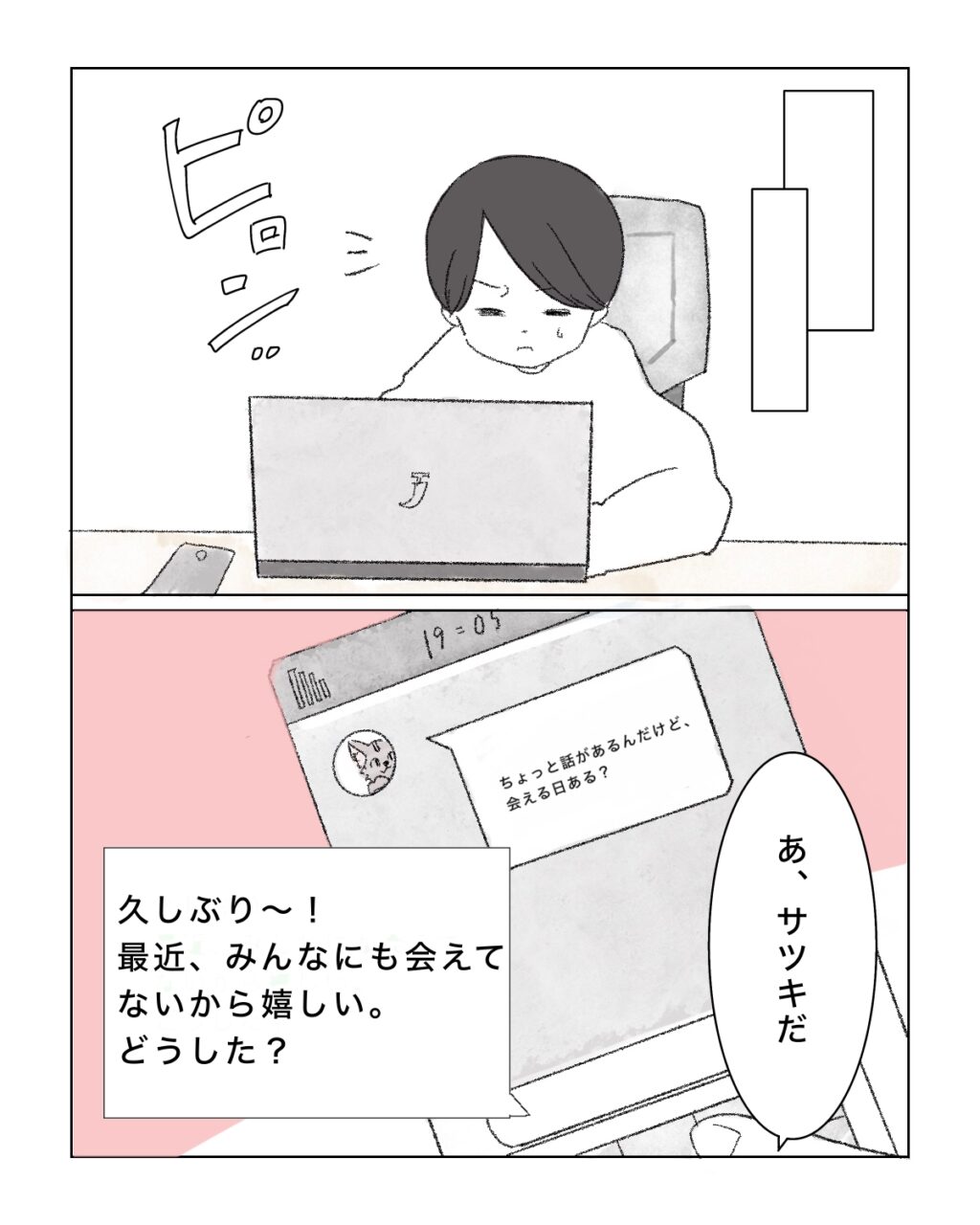 仕事がますます忙しくなり、アンナに会って浮気に協力して欲しいと言われたことも忘れかけていたある日、別の大学時代の友人サツキから久しぶりに連絡がありました。大学サークルで一緒だったみんなの集まりに最近は参加できていなかった私は、サツキの『話があるんだけど、会える日ある?』という誘いのメッセージに嬉しくなりました。