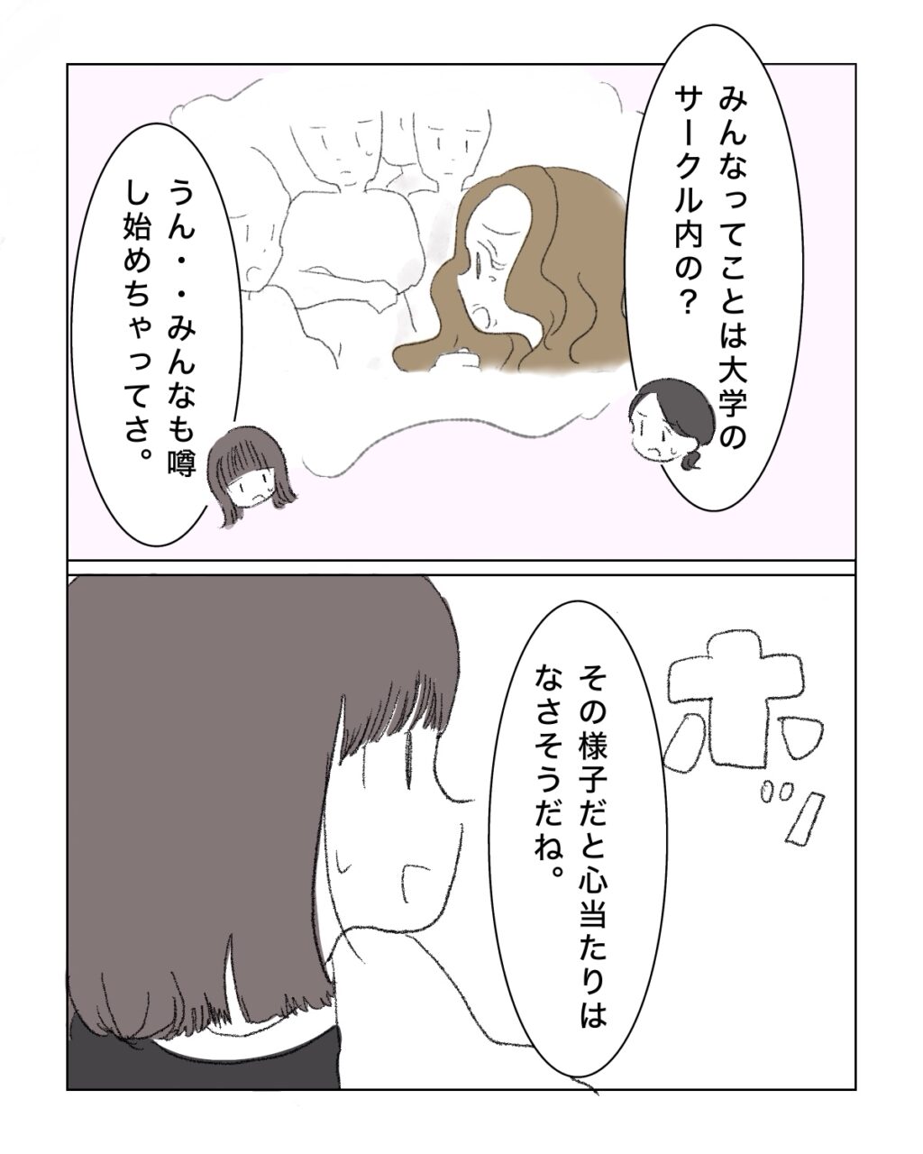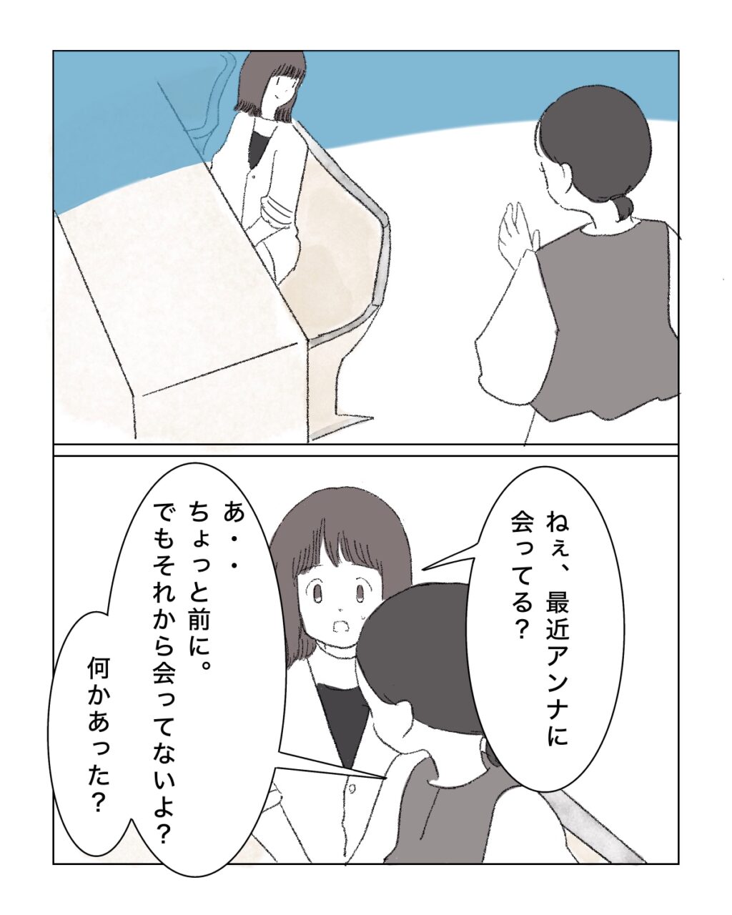 アンナが愚痴っているという『みんな』とは、大学のサークル仲間のことです。私が参加できなかった集まりのたびに、アンナが嘘ばかり広めていたなんて。「みんなも噂し始めちゃってさ。」とサツキ。噂の真相を確かめたくて、サツキは私に直接会いたかったようです。「その様子だと、心当たりはなさそうだね。」と、サツキはホッとしたように笑顔で言いました。