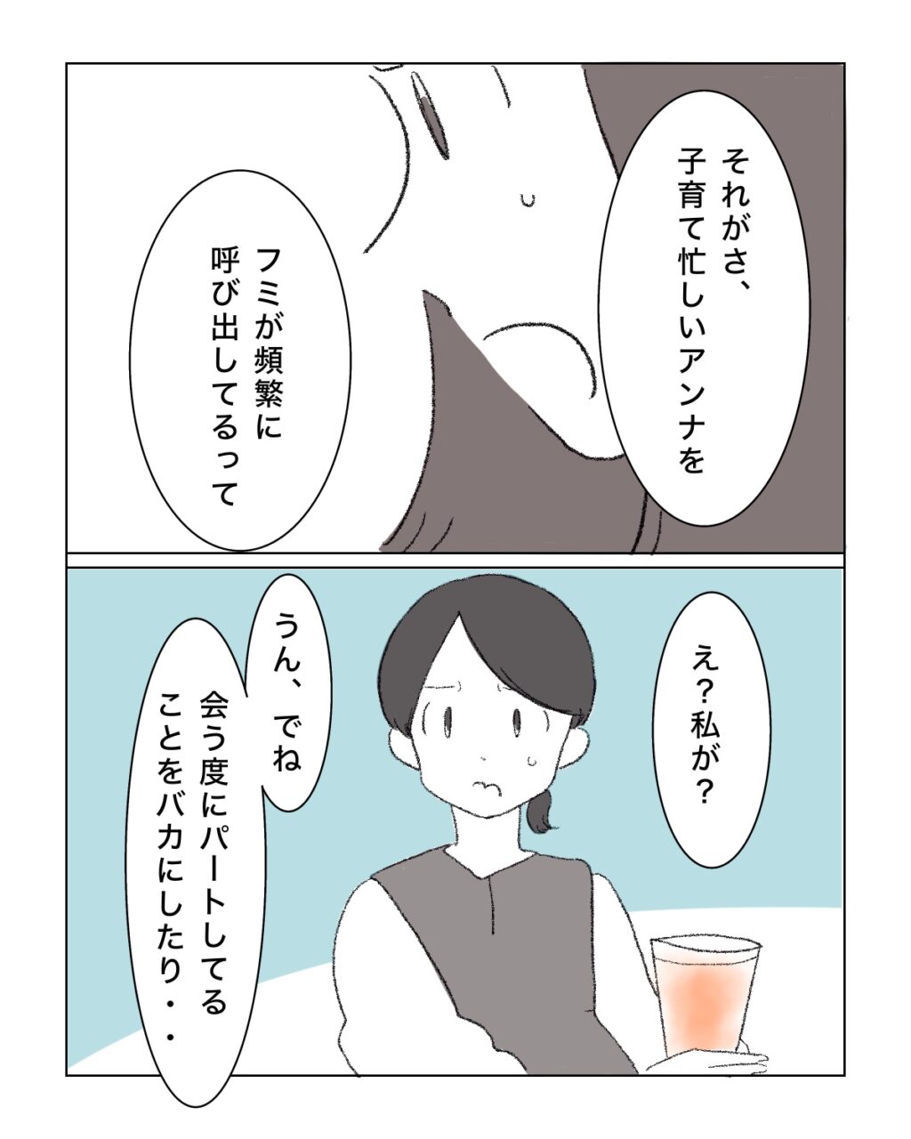 サツキは「それがさ、子育てで忙しいアンナを、フミが頻繁に呼び出してるって。」と私に確かめるように話し始めました。「え?私が?」身に覚えが全くないことを言われ思わず怪訝な顔になってしまった私に、サツキは「うん、でね、会うたびにパートしてることをバカにしたり・・・」と続けました。