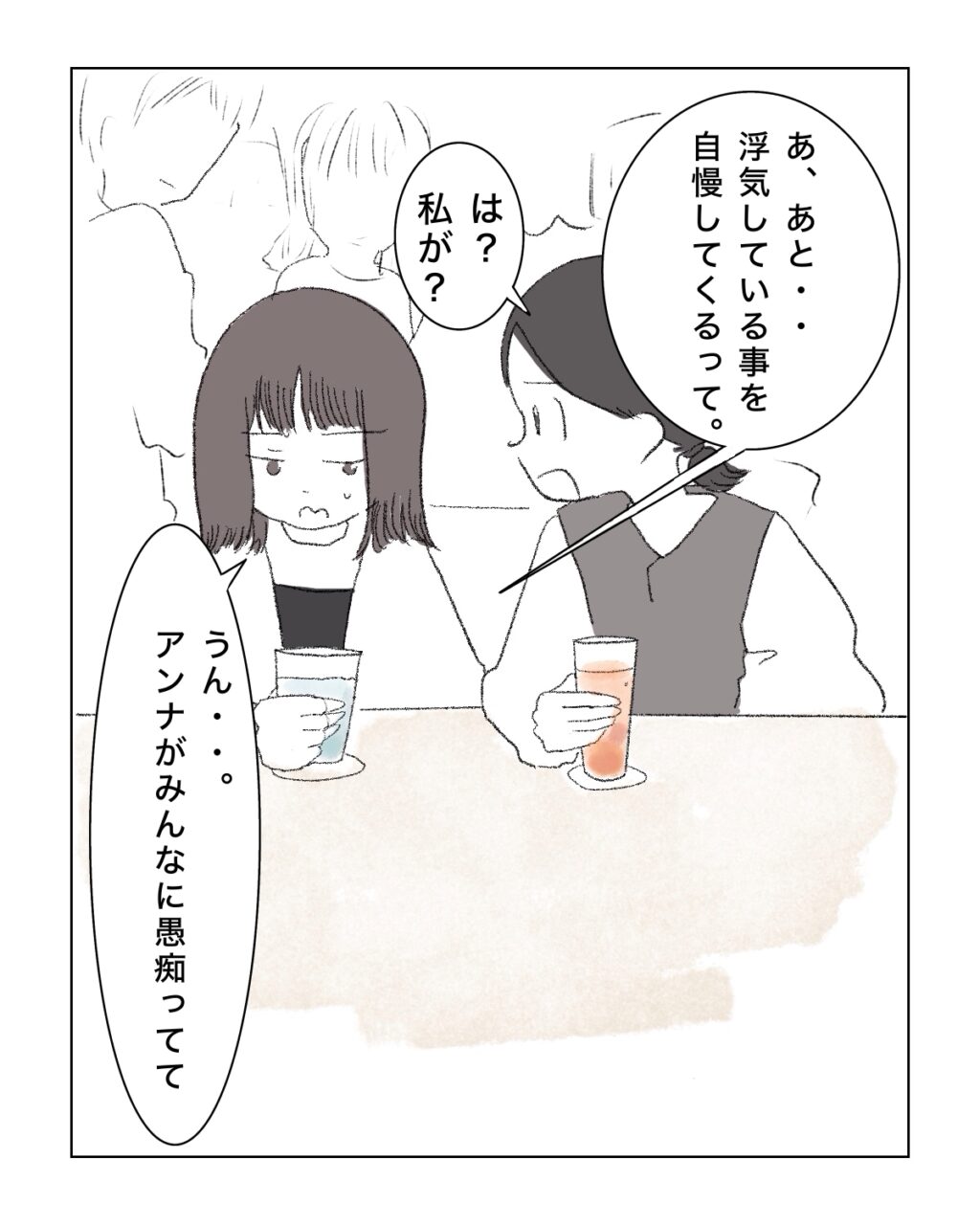 「あ、あと・・・浮気していることを自慢してくるって。」少し言いにくそうに視線を逸らして教えてくれたサツキ。「は?私が?」もう一度聞くと、「うん。アンナがみんなに愚痴ってて」と、根も葉もない噂の主はアンナであることがわかりました。