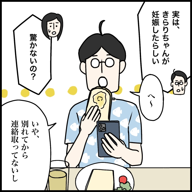 「きらりちゃんが来た」と伝えても陽太が動揺している様子はありません。そこで「きらりちゃんが妊娠したらしい」と本題をズバリ言いましたが、「へ~」とのん気に返事をした陽太。驚かないことに驚いている私に「いや、別れてから連絡取ってないし。」と答える陽太の声を聞く限り、嘘や誤魔化しは無いように聞こえました。