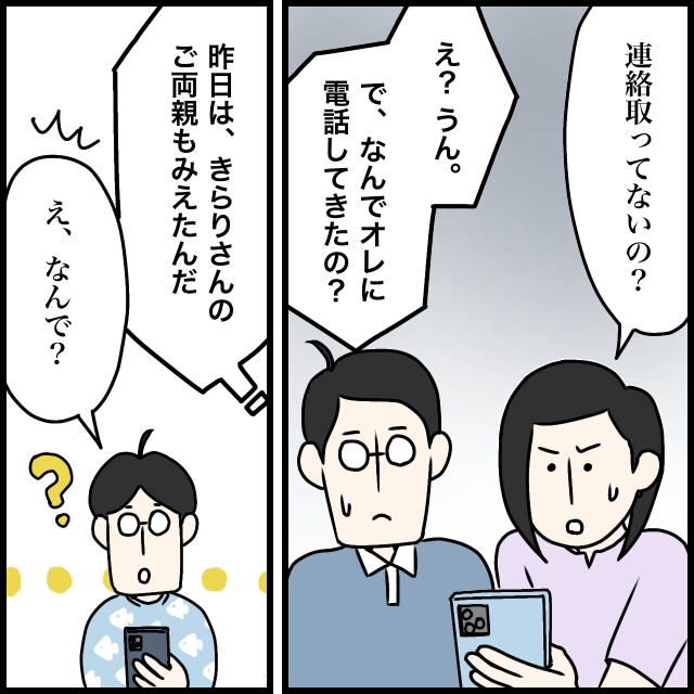 「連絡取ってないの?」と念を押すように聞く私。「え?うん。で、なんでオレに電話してきたの?」と陽太。心当たりが全くないようです。夫がもう少し突っ込んで「昨日は、きらりさんのご両親もみえたんだ」と言っても、「なんで?」とますます分からない様子の陽太です。