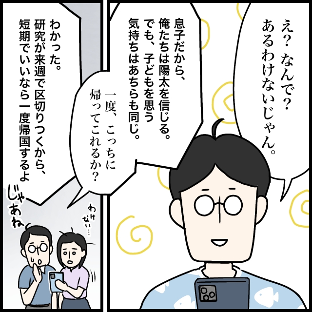 ところが陽太はまた「なんで?」と繰り返しました。「あるわけないじゃん。」とハッキリ否定したのです。「息子だから、俺たちは陽太を信じる。でも、子どもを思う気持ちはあちらも同じ。一度、こっちに帰って来れるか?」と聞いた夫に、陽太はすぐに「分かった。」と返事をしました。そして陽太は翌週に研究が一区切りついたタイミングで短期帰国することになりました。