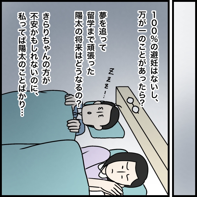 その夜。きらりちゃんのお腹の子どもについてキッパリと否定した陽太でしたが100%の避妊はないし、万が一のことがあったら?夢を追って留学まで頑張った陽太の将来はどうなるの?そんな風に息子のことを心配しては、きらりちゃんの方が不安かもしれないのに、息子のことばかり考えてしまった自分を反省し、その繰り返しでなかなか寝付けませんでした。