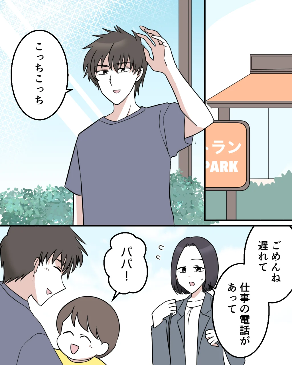 俺は小山大輔。バツイチです。今日は月に一度の息子奏斗との面会日。待ち合わせのファミレスの前で待っていると、元妻の凪子と奏斗の姿が見えました。「こっちこっち」と手をあげると、凪子が「ごめんね、遅れて。仕事の電話があって」と申し訳なさそうに小走りでやってきて、奏斗も「パパ!」と嬉しそうに俺のところに駆け寄って来ました。たまにしか会えないけれど、こうやって懐いてくれる奏斗が可愛くて仕方ありません。