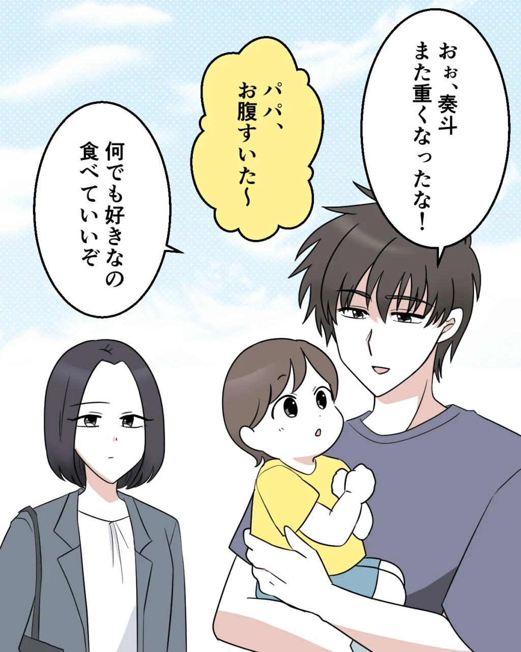 「おぉ、奏斗。また重くなったな!」抱き上げた奏斗は先月会った時よりも重くなっていて成長を感じます。「パパ、お腹すいた~」と言う奏斗が可愛くて「何でも好きなの食べていいぞ」と笑顔で答えます。