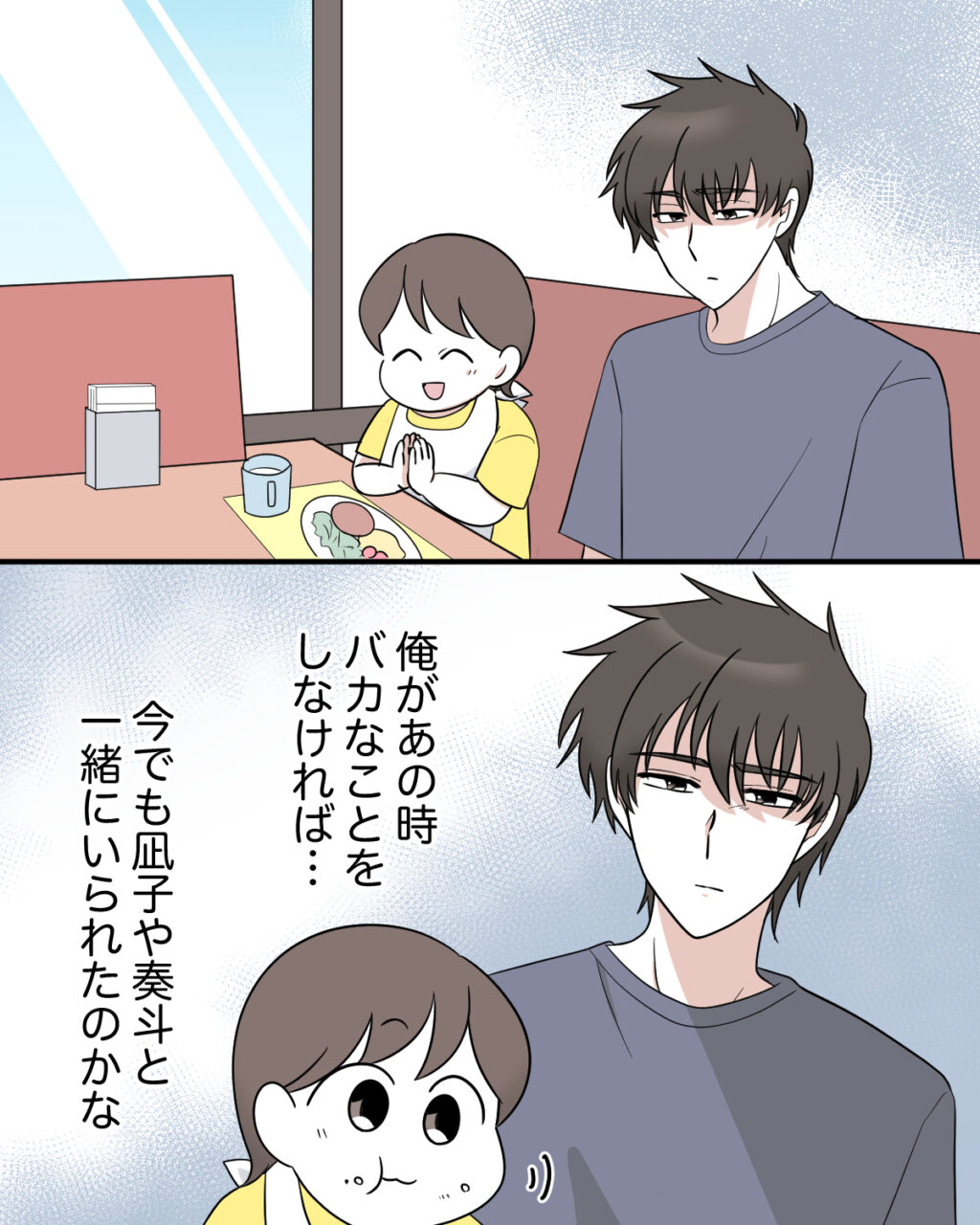 奏斗と2人でお店に入った俺は、お子様ランチを美味しそうに食べる奏斗を見つめながら「俺があの時バカなことをしなければ・・今でも凪子や奏斗と一緒にいられたのかな」と自分の犯してしまった過ちを後悔していました。
