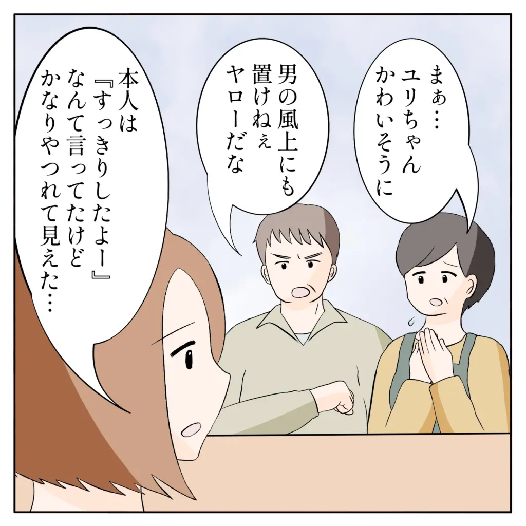 「まぁ・・ユリちゃんかわいそうに」「男の風上にも置けねぇヤローだな」と父と母が言うのを聞いて、「本人は『すっきりしたよー』なんて言ってたけど、かなりやつれて見えた・・」と姉ちゃんが言ったかと思うと、
