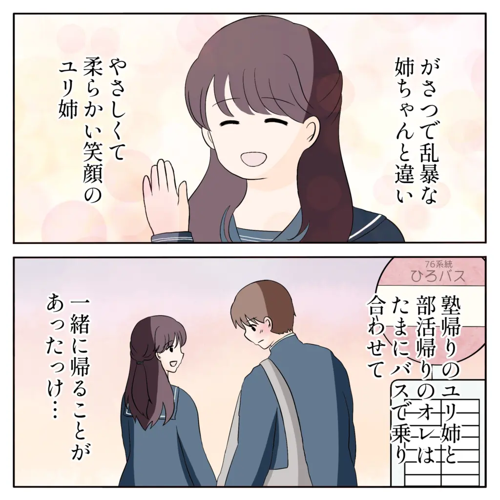 がさつで乱暴な姉ちゃんと違い、やさしくて柔らかい笑顔のユリ姉。塾帰りのユリ姉と部活帰りの俺は、たまにバスで乗り合わせて一緒に帰ることがあったっけ・・と学生時代を思い出す俺。