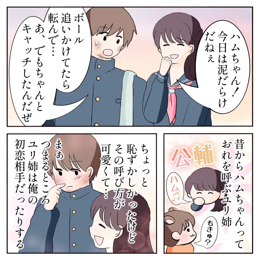 「ハムちゃん!今日は泥だらけだねぇ」ユリ姉にそう言われ、「ボール追いかけてたら転んで・・あ、でもちゃんとキャッチしたんだぜ」と答えつつ、「昔から『ハムちゃん』って俺を呼ぶユリ姉。ちょっと恥ずかしかったけど、その呼び方が可愛くて・・。まぁ、つまるところ、ユリ姉は俺の初恋相手だったんだ。