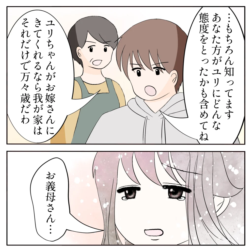 離婚してもなおユリさんを見下し続ける元夫。でも、今はユリさんには力強い味方がいます。公輔さんや公輔さんの両親がみんなでユリさんを守ってくれて頼もしいですね。