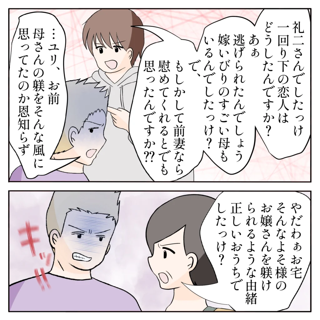 「礼二さんでしたっけ。一回り下の恋人はどうしたんですか?あぁ、逃げられたんでしょう。嫁いびりのすごい母親もいるんでしたっけ?で、もしかして前妻なら慰めてくれるとでも思ったんですか??」俺が一気にまくし立てると、「・・ユリ、お前、母さんの躾をそんな風に思ってたのか。恩知らず」とまたしてもユリを悪く言う元夫。母さんが「やだわぁ。お宅、そんなよそ様のお嬢さんを躾けられるような由緒正しいおうちでしたっけ?」と言うと、言葉に詰まり悔しそうに母さんのことを睨みつけていました。