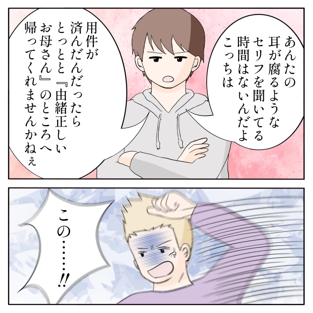 「あんたの耳が腐るようなセリフを聞いてる時間はないんだよこっちは。用件が済んだんだったらとっとと『由緒正しいお母さん』のところへ帰ってくれませんかねぇ」俺が嫌味をたっぷり込めてそう言うと、激高した元夫が「この・・!!」と拳を振り上げました。