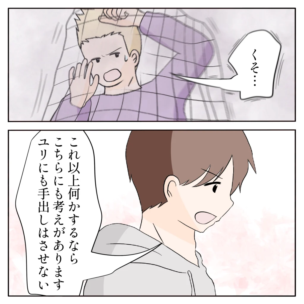 身動きが取れず「くそ・・」とネットの中でじたばたする元夫に、俺は「これ以上何かするならこちらにも考えがあります。ユリにも手出しはさせない」ときっぱり言いました。ユリのことは俺が絶対に守るんだ。