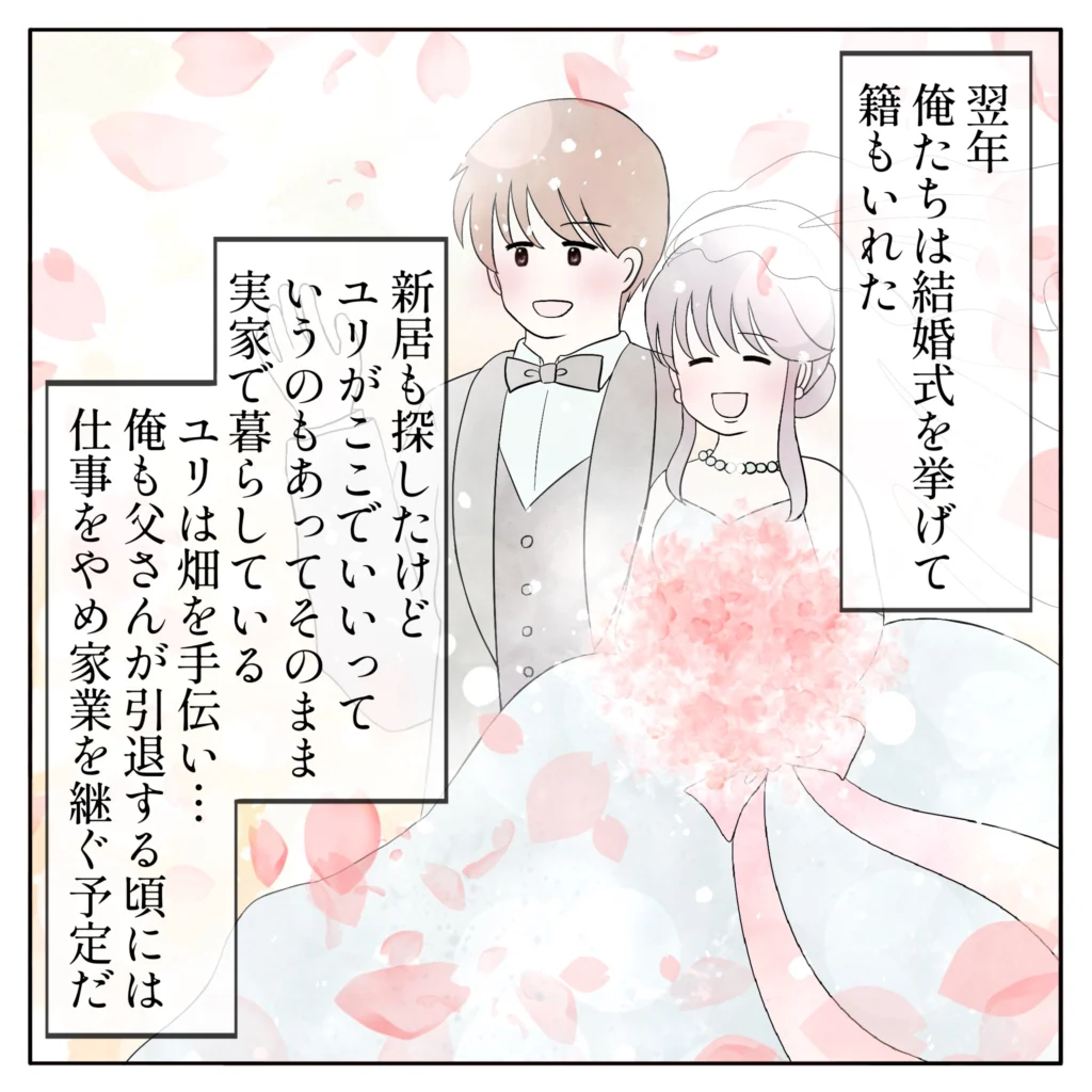 翌年、俺たちは予定どおり結婚式を挙げて籍もいれました。一度は新居も探したけれど、ユリがここでいいと言うのでそのまま実家で両親と一緒に暮らしています。ユリは今までと同じように両親の農業を手伝ってくれており、俺も父さんが引退する頃には仕事を辞めて家業を継ぐ予定です。