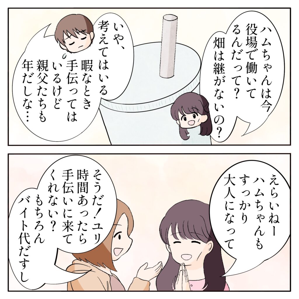 「ハムちゃんは今、役場で働いてるんだって?畑は継がないの?」ユリ姉にそう聞かれ、「いや、考えてはいる。暇なとき手伝ってはいるけど、親父たちも年だしな・・」俺がそう答えると、「えらいねー。ハムちゃんもすっかり大人になって」ユリ姉がそう言うと、「そうだ!ユリ時間あったら手伝いに来てくれない?もちろんバイト代出すし」と言い出す姉ちゃん。