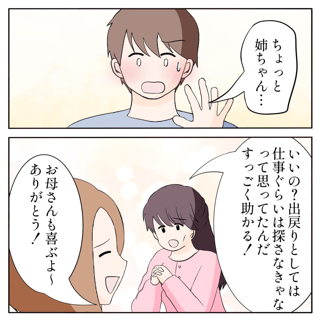 「ちょっと姉ちゃん・・」と慌てて声をかかげると、「いいの?出戻りとしては仕事ぐらいは探さなかな。って思ってたんだ。すっごく助かる!」と懇願するようなユリ姉、姉ちゃんは、「お母さんも喜ぶよ~。ありがとう!」笑顔でそう言いました。