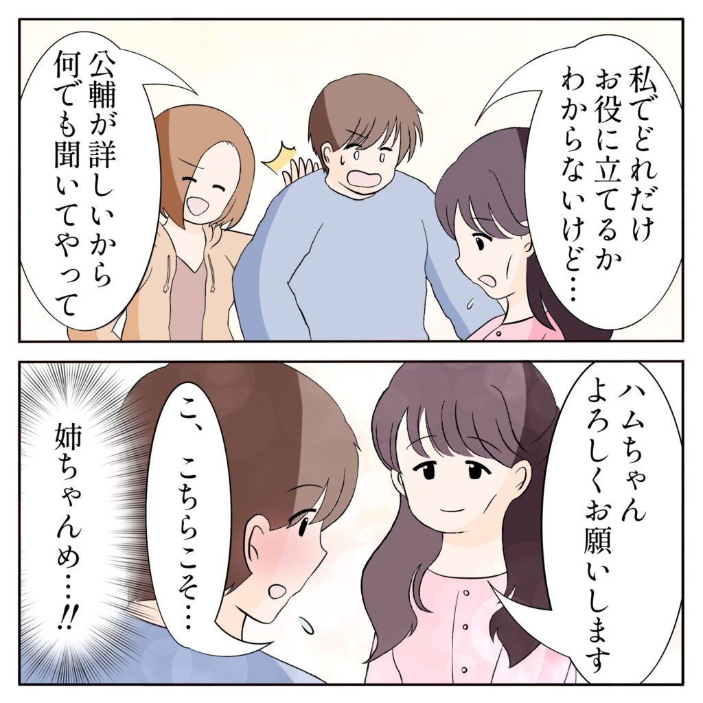 「私でどれだけお役に立てるかわからないけど・・」と謙遜するユリ姉。すると、「公輔が詳しいから何でも聞いてやって」と、姉ちゃんがそう言い出すと、「ハムちゃんよろしくお願いします。」と丁寧にお辞儀され、「こ、こちらこそ・・」と答えたものの、「姉ちゃんめ・・!!と心の中で怒っていたのでした。