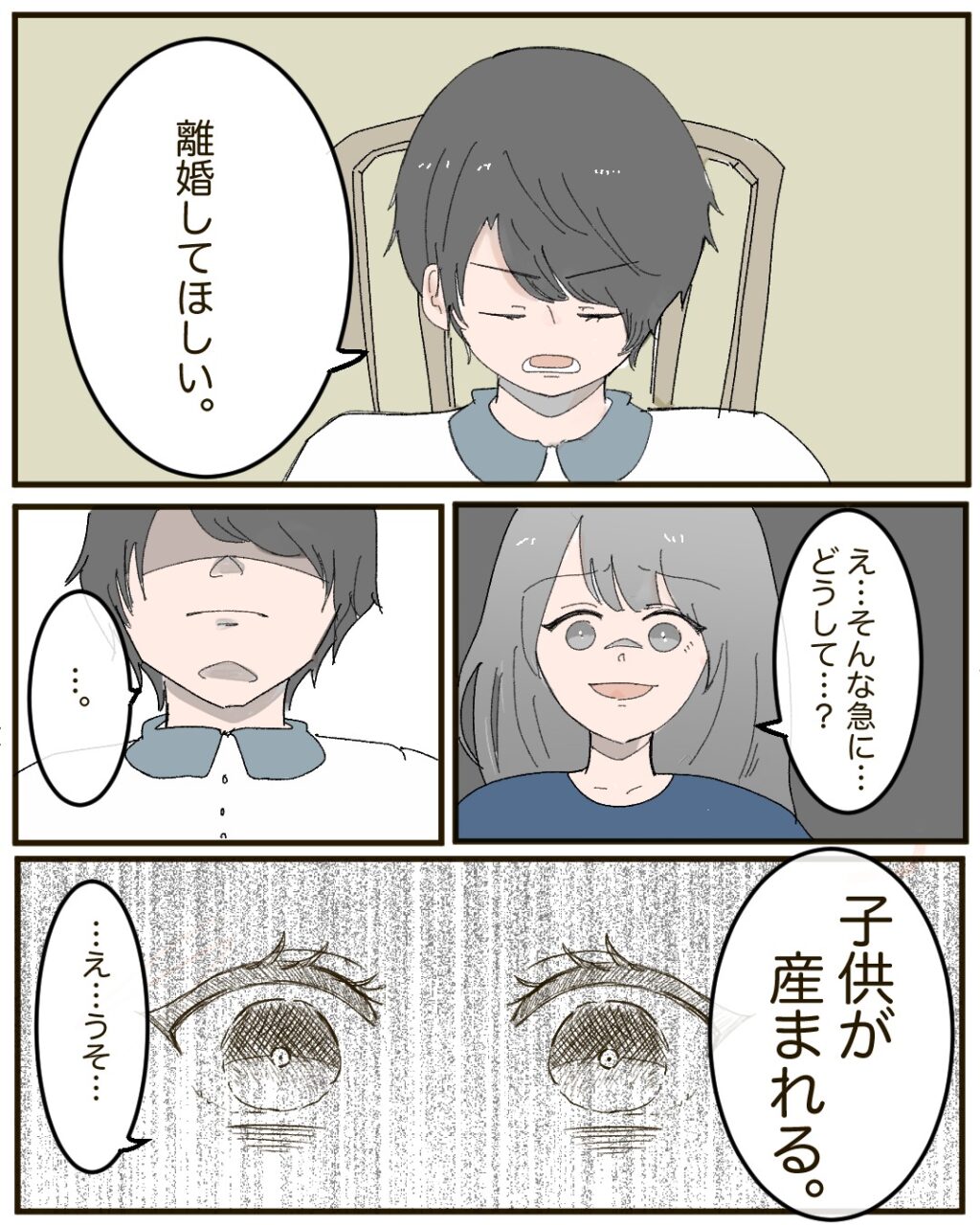 「離婚してほしい。」突然、夫つかさに切り出された時には何を言われているのか分からず言葉に詰まりました。そんな私に、つかさは更に衝撃的な言葉を発したのです。「子供が産まれる。」