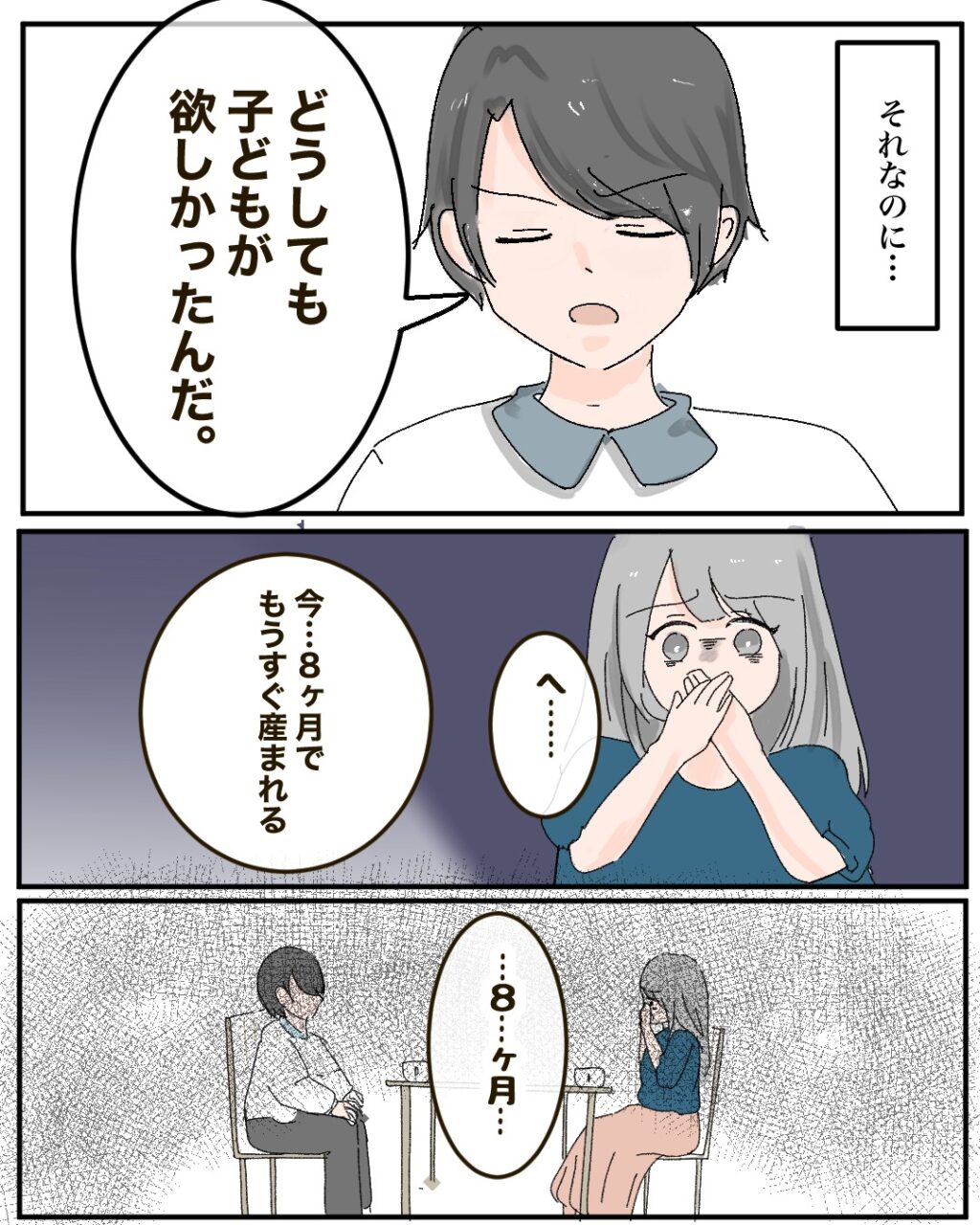 それなのに、「どうしても子供が欲しかった」というつかさには、私ではない誰かがいて、その女性がもうすぐつかさの子を産むなんて。絶句しました。