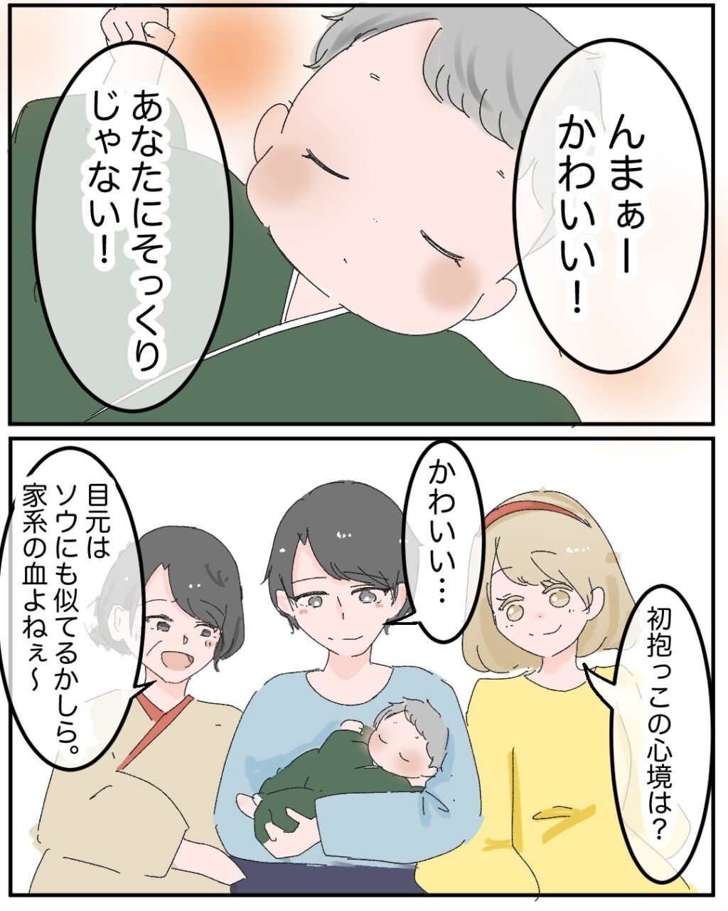 出産と入院を経て、やっと息子のリュウが家にやって来ました。いつもは厳しい母も「あなたにそっくりじゃない!目元はソウにも似てるかしら、家系の血よねぇ~」とメロメロです。腕の中で穏やかに眠るリュウを見て、胸がいっぱいになりました。