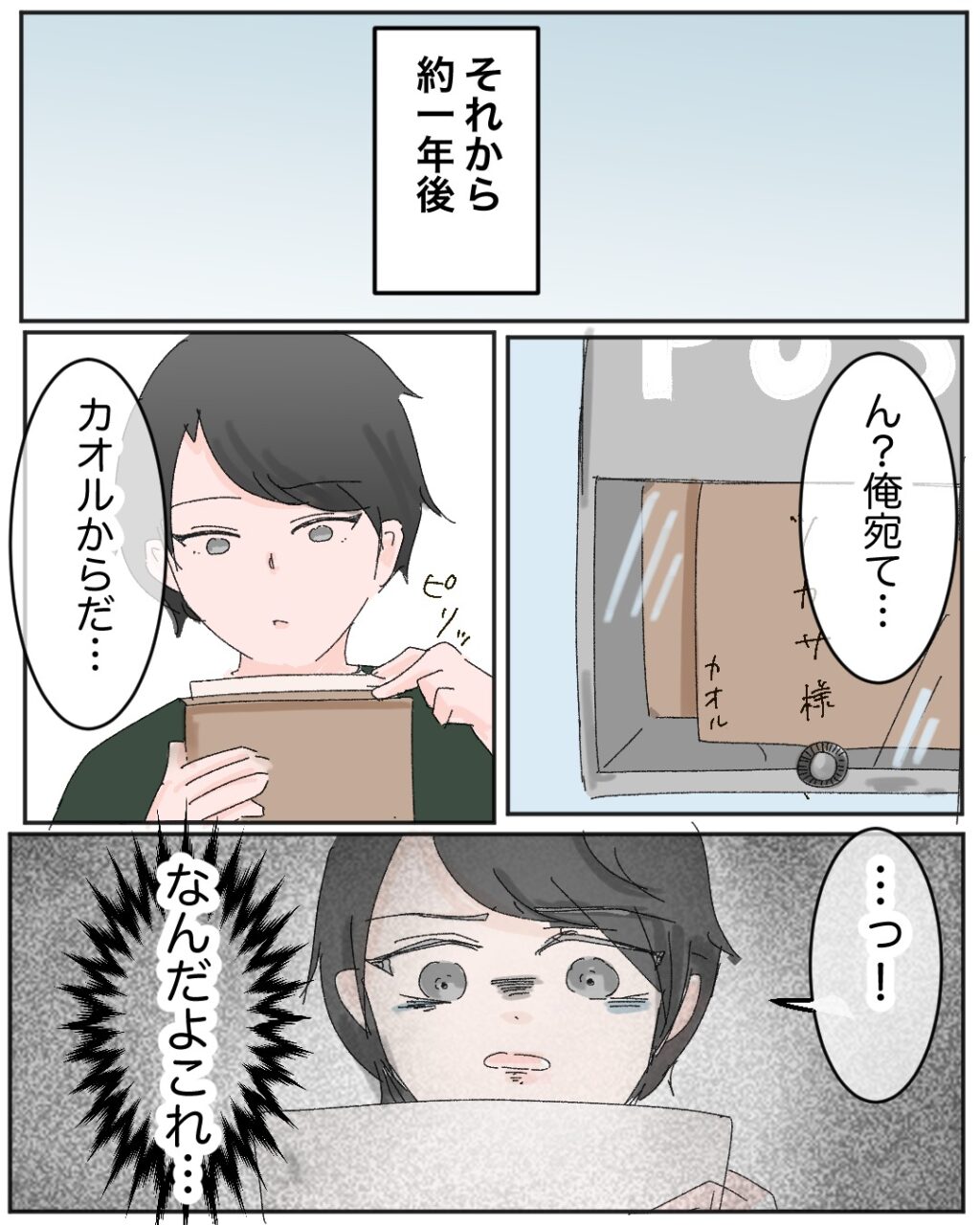 仕事に子育てに、忙しなく過ぎる毎日。大変に感じることもありますが、チナツとリュウの3人で幸せな生活を送っていました。リュウが産まれてから約1年後、俺のもとに一通の封筒が届きます。差出人を見ると、1年以上前に別れた元妻のカオルからでした。離婚するときに書類を送り忘れたのか?そう思って封筒を開くと、そこには目を疑うような内容が記されていました。